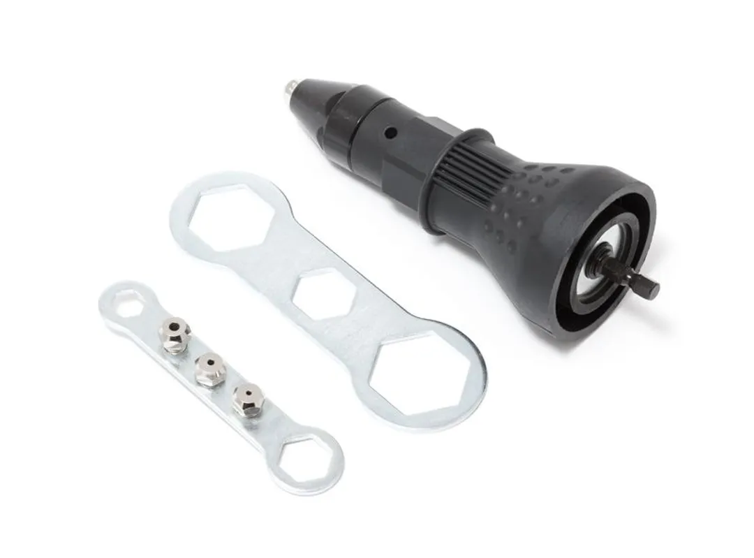 Адаптер-заклепочник для дрели ( min 11Nm, max 1000 об/мин), в блистере. Посадочный квадрат 1/4". Такая насадка позволяет привычную дрель и даже шуруповерт быстро превратить в полноценный заклепочник, с помощью которого можно создавать клепальные соединения, не уступающие по прочности сварным швам. Минимальнаная мощность шуруповерта - 11Hm. Максимальные обороты шуруповерта - 1000 об/мин. С помощью такого адаптера можно работать с заклепками различных диаметров, при этом производительность устройства мало в чем будет уступать классическому аналогу таких приспособлений. Максимально простая конструкция не требует никаких сложных операций для подсоединения к носителю, набор необходимых инструментов, которые требуются при этом, включены в комплект. Для работы с адаптером-заклепочником не нужны особо мощные электроинструменты, так как его технические требования не превышают средних характеристик самых ходовых моделей дрелей или шуруповертов.