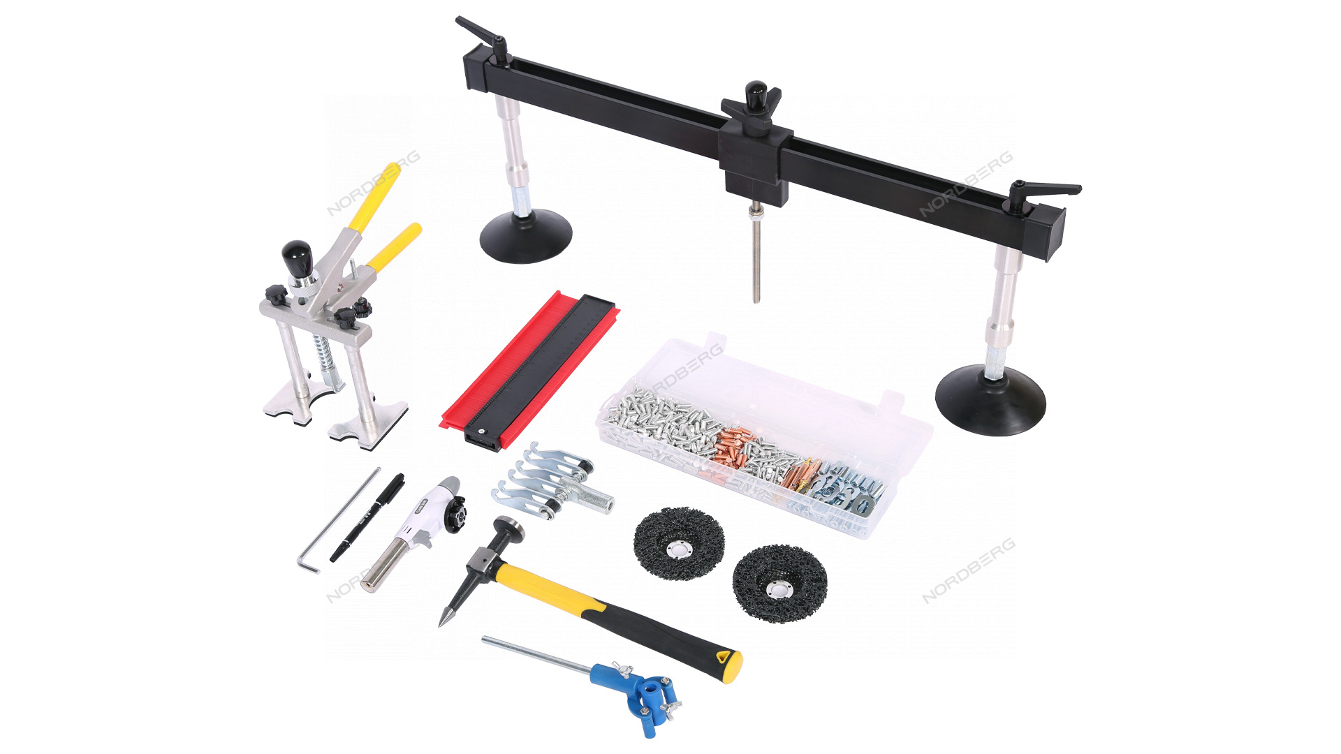 1 сварочный аппарат 1 2 сварочный пистолет в сборе 1 3 кабель массы в сборе с зажимом 1 4 пуллер для быстрого выправления 1 5 многозахватный вытягиватель М10 1 6 инструмент для нанесения разметки 1 7 пуллер для выправления по алюминию 1 8 шлифовальный диск 2 9 молоток 1 10 газовая горелка 1 11 копировальный шаблон 1 12 адаптер М4, М5, М6 4 13 шпилька стальная М6 50 14 шпилька алюминиевая М4 50 15 шпилька алюминиевая М5 50 16 шпилька алюминиевая М6 300 17 ОТ-шайба резьбовая для приварных шпилек M4 6 18 ОТ-шайба резьбовая для приварных шпилек M5 6 19 ОТ-шайба резьбовая для приварных шпилек M6 10 20 коробка с аксессуарами 1 21 паспорт-инструкция