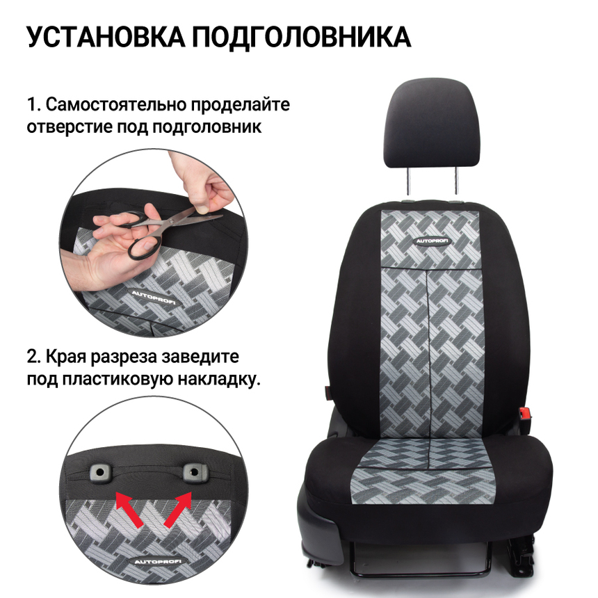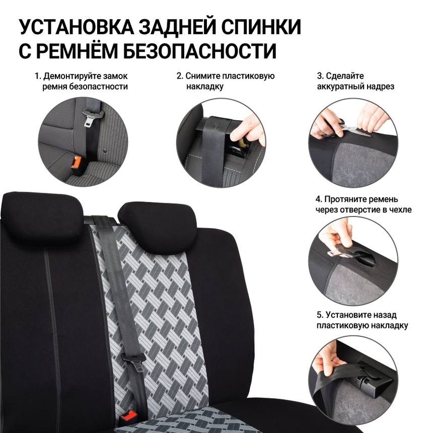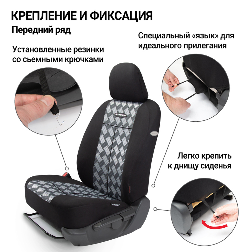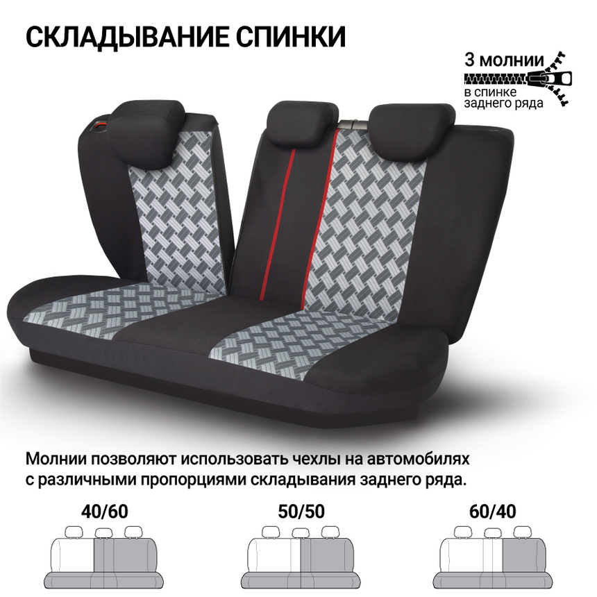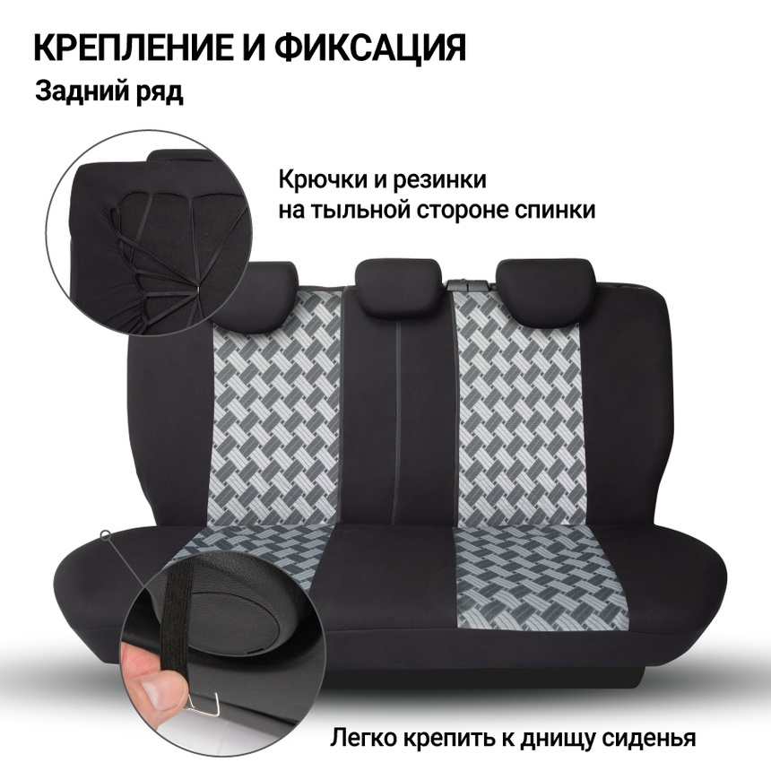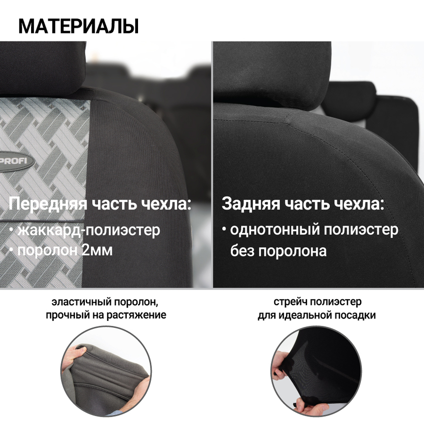 Чехлы из прочного жаккарда для переднего и заднего ряда. Сложное плетение ткани создает красивый объемный узор. Чехлы их жаккардовой ткани устойчивы к растяжению. Материал хорошо пропускает воздух и отводит влагу. Универсальный размер подходит большинству автомобильных сидений. Распускаемый шов для боковых подушек Airbag на передних сиденьях имеет специальную метку, чтобы исключить неправильную установку чехлов. Молнии в спинке заднего ряда для модульных сидений с секциями 40:60, 50:50, 60:40.