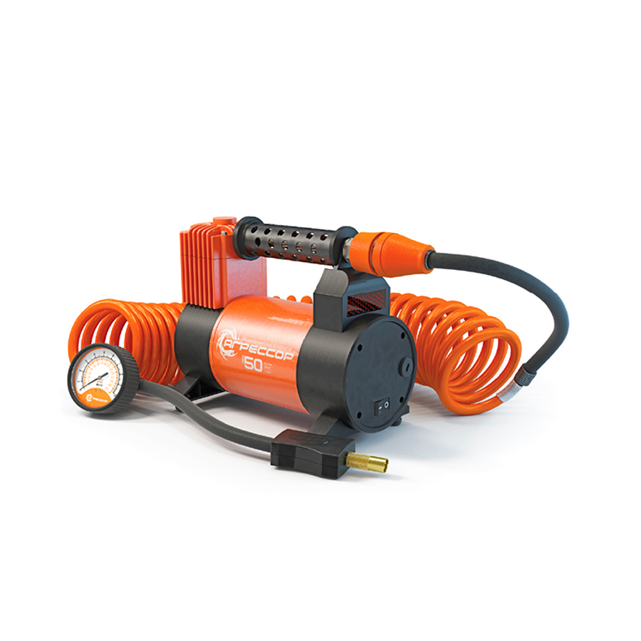 Автомобильный компрессор в металлическом корпусе. Производительность — 50 л/мин при максимальном давлении 10 атм. Универсальная модель для большинства современных автомобилей.