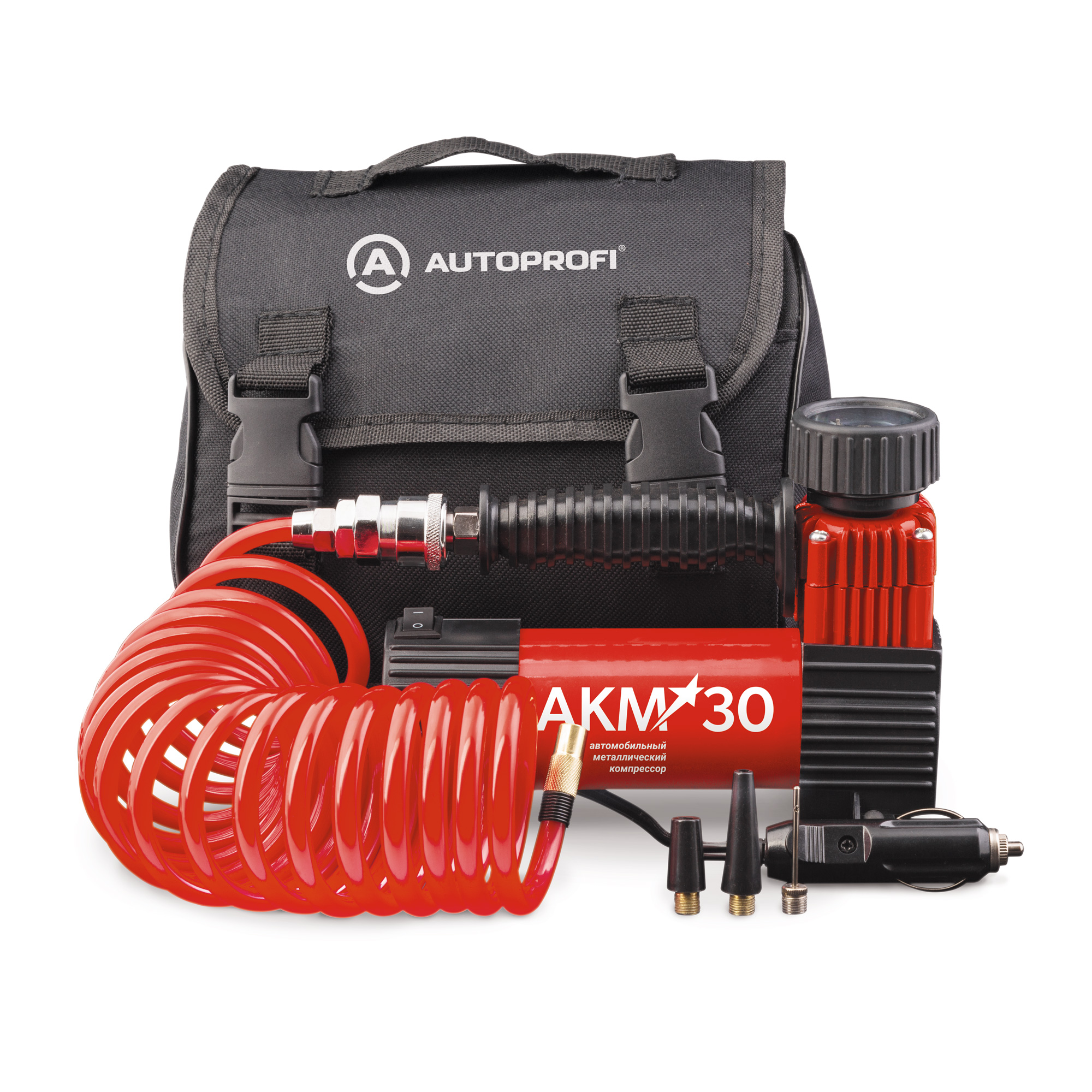 Линейка компрессоров AUTOPROFI серия АКМ - это новый дизайн, хорошая производительность, и комплектация, включающая в себя все необходимое. Металлический корпус и цельнометаллический поршневой насос на всех компрессорах линейки АКМ. Компрессор АКМ-30 оборудован защитой от перегрева, точным двушкальным манометром, быстросъемным шлангом, кабелем питания 3 метровой длины и удобной сумкой для хранения и переноски. Компрессор позволяет полностью удовлетворить ожидания потребителей, которые ищут «ЗОЛОТУЮ СЕРЕДИНУ», при этом оставаясь полноценными компрессорами для накачивания шин автомобилей, велосипедов и других надувных изделий.