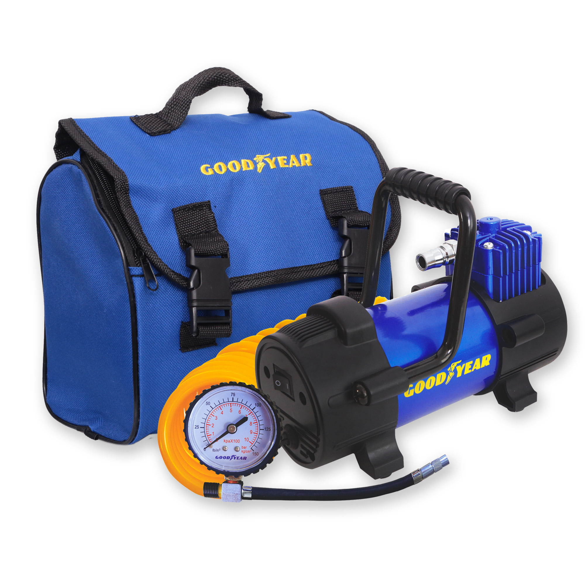 Классический поршневой компрессор со стандартной производительностью Компрессор воздушный Goodyear "GY-40L" предназначен для накачивания автомобильных шин, колес, велосипедов, мячей и матрацев. Эргономичная конструкция с разборной ручкой, а так же матерчатой сумкой в комплекте, позволяет "спрятать" компрессор в любую нишу автомобиля.