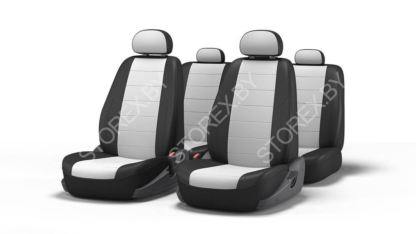 - Тыльные и боковые части чехлов сделаны из гладкой экокожи, а центральная часть из перфорированной экокожи.
