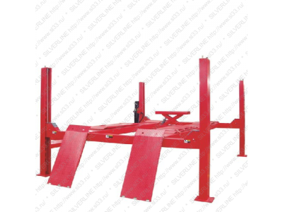 Электрогидравлический 4-ех стоечный подъемник с передними поворотными площадками для колес( поворотными кругами), задними подвижными платформами и гидравлической траверсой.