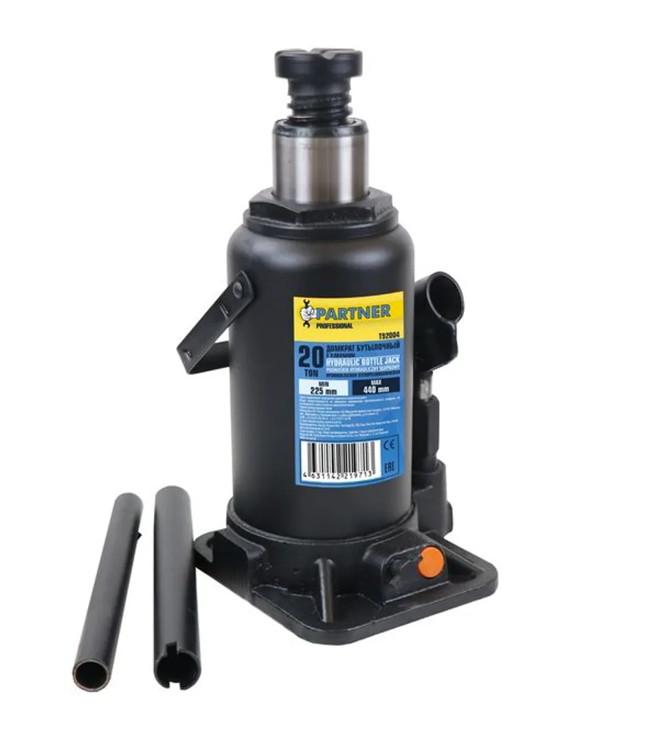 Бутылочный гидравлический домкрат. Мощное и надежное средство для поднятия и удержания автомобилей. Домкрат оснащен специальным предохранительным клапаном для защиты от перегрузки. Этот домкрат обеспечивает безопасное поднятие, что делает его отличным выбором как для автомастерских, так и для личного использования.