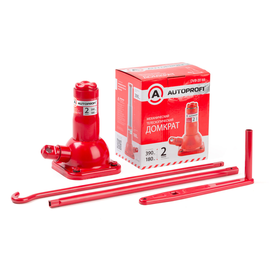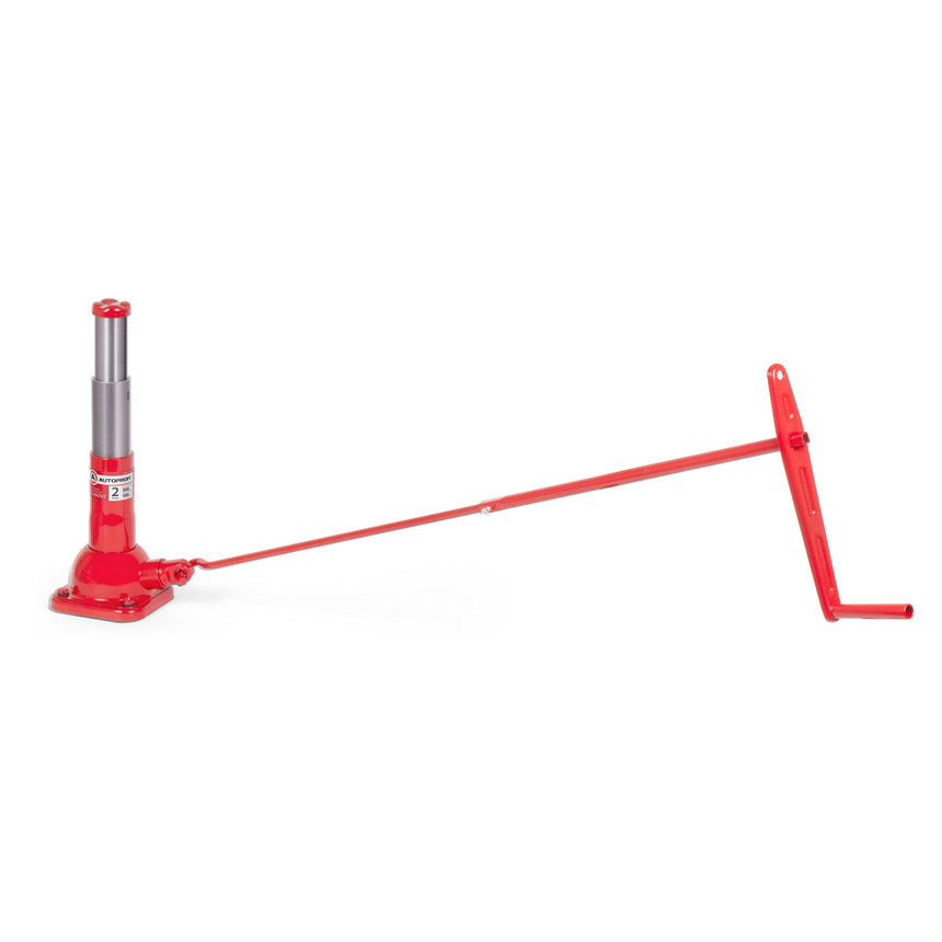 Автомобильный домкрат поднимает вес до 2 тонн. Высота от 180 до 390 мм. С домкратом можно работать, не сгибаясь. Длинный вороток дает длину рычага в 85 см.