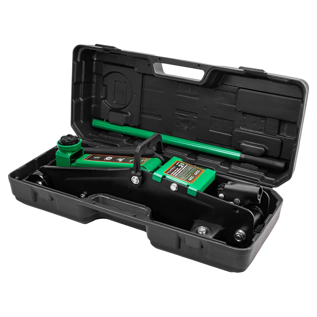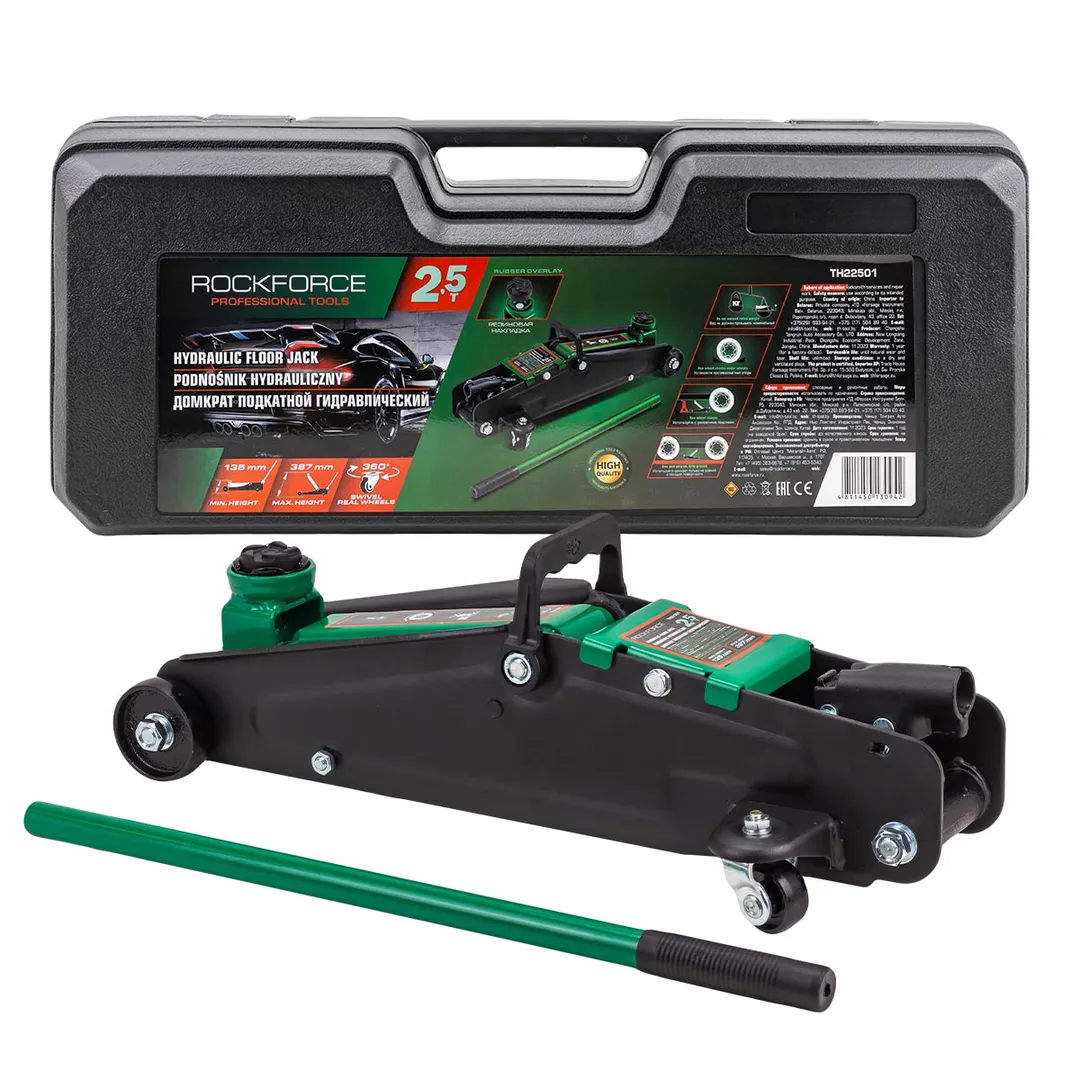 Домкрат подкатной гидравлический 2,5т, максимальная нагрузка 2,5т, высота подхвата 135 мм, высота подъёма 387 мм. Идеально подходит для ежедневного использования в автомастерской, на шиномонтаже или в гараже. Прочный гидравлический блок с поршневым насосом обеспечивает быстрый подъем автомобиля без особых усилий. Подъем и опускание можно легко регулировать. Мобильность и надежность: домкрат оснащен 2 фиксированными и 2 поворотными колесами, поэтому его можно легко перемещать. Благодаря предохранительному клапану домкрат соответствует стандарту безопасности. В комплекте прочная резиновая накладка, которая предотвращает от повреждения автомобиля: исключает возможность повредить кузов, предохраняет от самопроизвольного соскальзывания. Домкрат поставляется в прочном пластиковом кейсе.