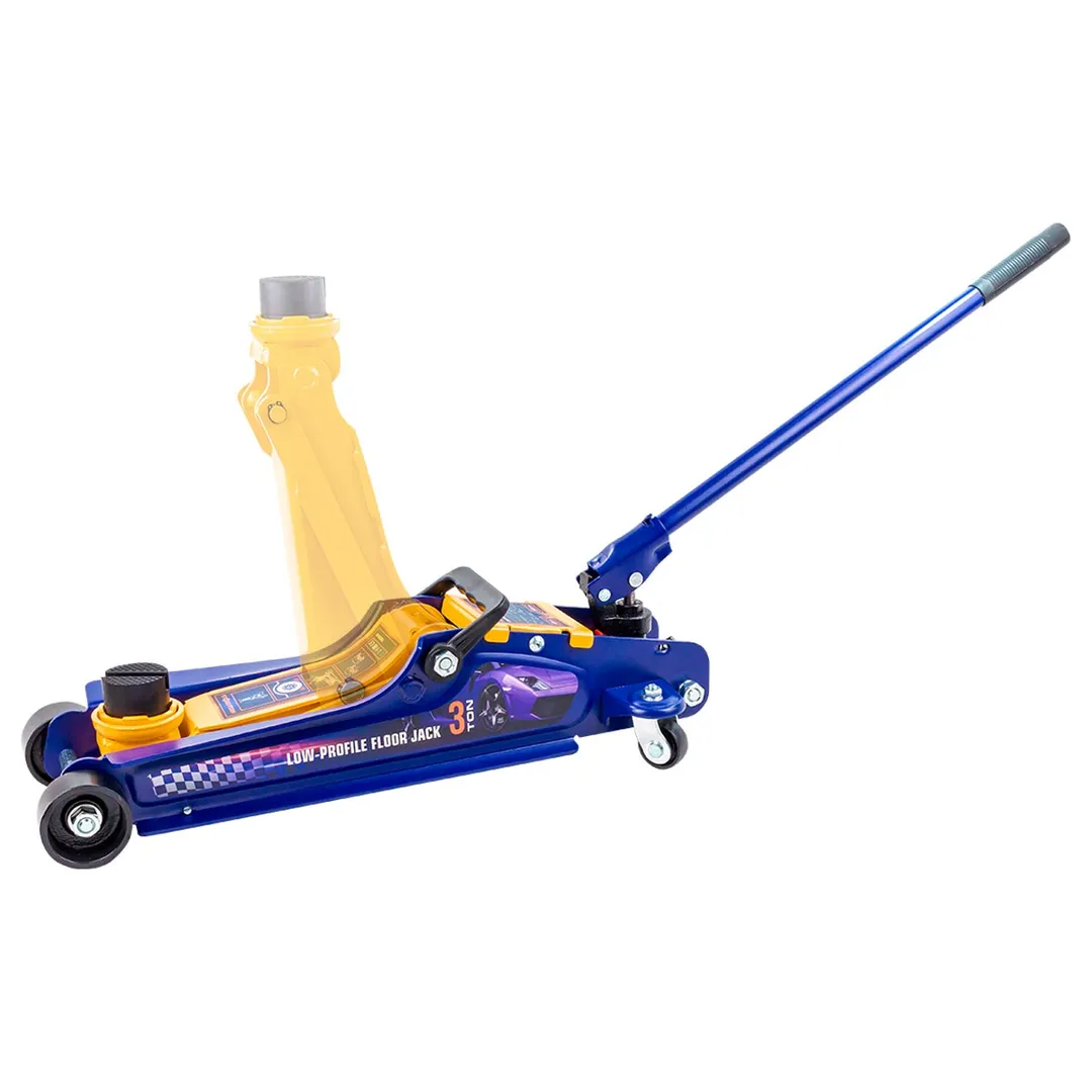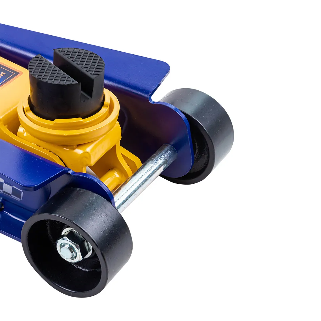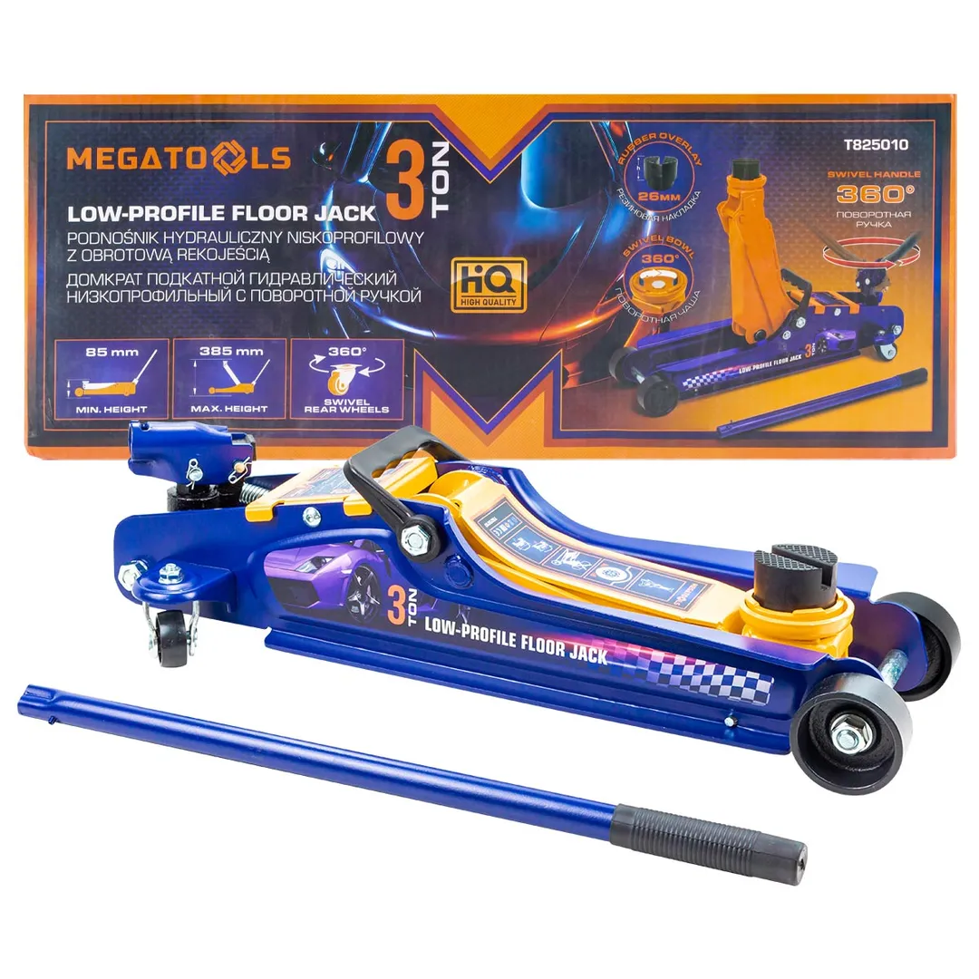 Домкрат подкатной гидравлический 3т идеально подходит для ежедневного использования в автомастерской, на шиномонтаже или в гараже. Прочный гидравлический блок с поршневым насосом обеспечивает быстрый подъем автомобиля без особых усилий. Подъем и опускание можно легко регулировать. Мобильность и надежность: домкрат оснащен 2 фиксированными и 2 поворотными колесами, поэтому его можно легко перемещать. Благодаря предохранительному клапану домкрат соответствует стандарту безопасности. Особенность конструкции - низкий профиль: подходит для использования с низким клиренсом (спорткары и некоторые седаны); поворотная ручка обечспечивает удобство при работе в ограниченных пространствах. Максимальная нагрузка: 3000 кг. Высота подхвата 85 мм. Высота подъёма 380 мм. В комплекте прочная резиновая накладка, которая предотвращает от повреждения автомобиля: исключает возможность повредить кузов, предохраняет от самопроизвольного соскальзывания.