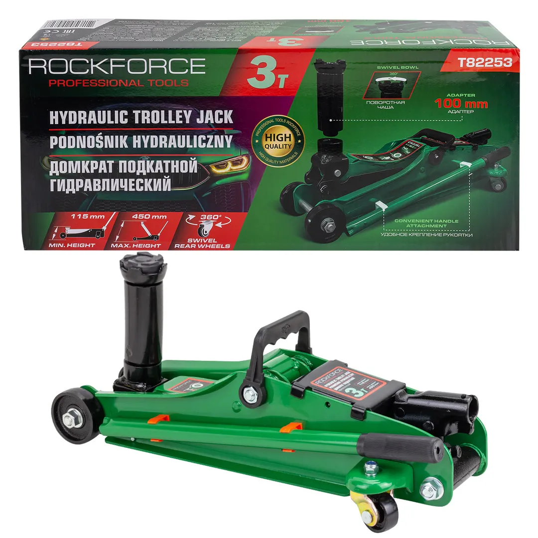 Домкрат гидравлический подкатной ROCKFORCE — это профессиональное оборудование грузоподъемностью 3 тонны, предназначенное для выполнения подъемных операций при обслуживании и ремонте автомобилей. Конструкция домкрата обладает усиленной стальной рамой и системой задних колес на 360°, обеспечивающей маневренность и устойчивость при работе с нагрузками. Рабочий диапазон высоты подхвата составляет от 115 мм до 450 мм, что позволяет работать с транспортными средствами с различным клиренсом. Оборудование оснащено адаптером длиной 100 мм и поворотной чашей на 360 градусов, что обеспечивает точное позиционирование и равномерное распределение нагрузки. Домкрат имеет удобное крепление рукоятки для простоты транспортировки и оснащен предохранительным клапаном. Предназначен для использования строго по назначению на твердой, ровной и устойчивой поверхности.