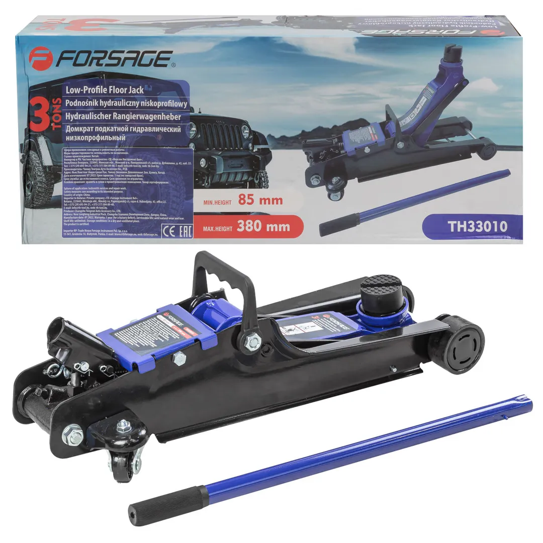 Домкрат подкатной гидравлический 3 т низкопрофильный Forsage F-TH33010. Высококачественная и прочная конструкция для длительного и надежного использования - идеально подходит для ежедневного использования в автомастерской, на шиномонтаже или в гараже. Прочный гидравлический блок с поршневым насосом обеспечивает быстрый подъем автомобиля без особых усилий. Подъем и опускание можно легко регулировать. Мобильность и надежность: Домкрат оснащен 2 фиксированными и 2 поворотными колесами, поэтому его можно легко перемещать. Благодаря предохранительному клапану домкрат соответствует стандарту безопасности. Особенность конструкции - низкий профиль: подходит для использования с низким клиренсом (спорткары и некоторые седаны).Максимальная нагрузка: 3 тонны. Высота подъема: 85 – 380 мм. Для быстрого и легкого подъема. Предохранительный клапан. В комплекте прочная резиновая накладка с прорезью - в целях предотвращения повреждения автомобиля: исключает возможность повредить кузов, предохраняет от самопроизвольного соскаль