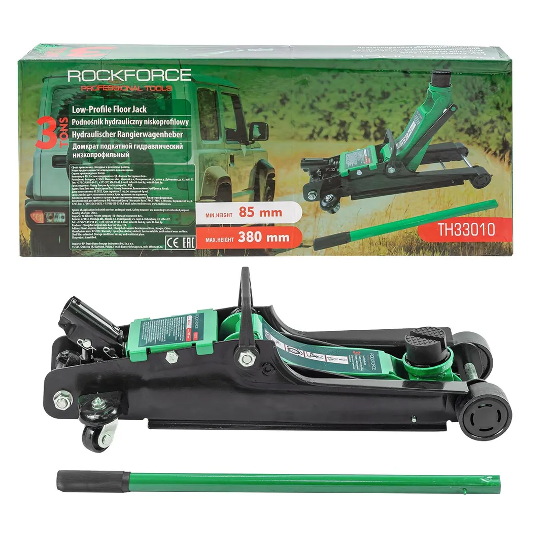 Домкрат подкатной гидравлический 3 т от бренда Rockforce. Идеально подходит для ежедневного использования в автомастерской, на шиномонтаже или в гараже. Прочный гидравлический блок с поршневым насосом обеспечивает быстрый подъем автомобиля без особых усилий. Подъем и опускание можно легко регулировать. Мобильность и надежность: домкрат оснащен 2 фиксированными и 2 поворотными колесами, поэтому его можно легко перемещать. Благодаря предохранительному клапану домкрат соответствует стандарту безопасности. Особенность конструкции - низкий профиль: подходит для использования с низким клиренсом (спорткары и некоторые седаны). Максимальная нагрузка: 3000 кг. Высота подхвата 85 мм. Высота подъёма 380 мм. В комплекте прочная резиновая накладка, которая предотвращает от повреждения автомобиля: исключает возможность повредить кузов, предохраняет от самопроизвольного соскальзывания.
