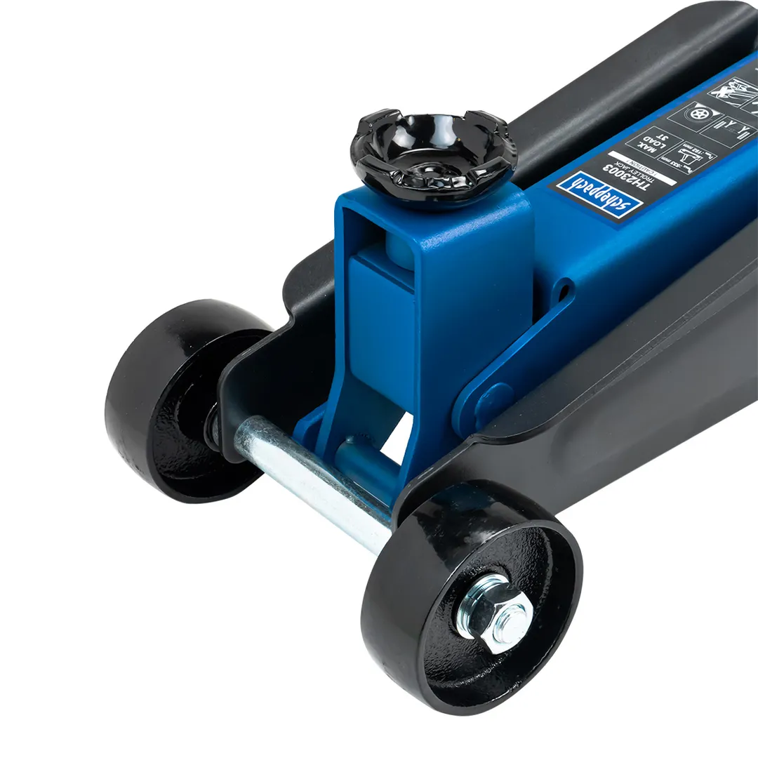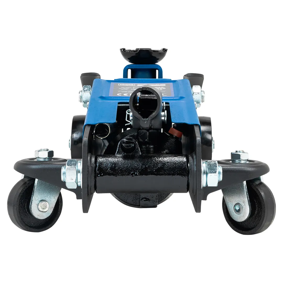 Домкрат имеет два поворотных колеса на 360 градусов для плавной маневренности и 2 фиксированных для устойчивости.