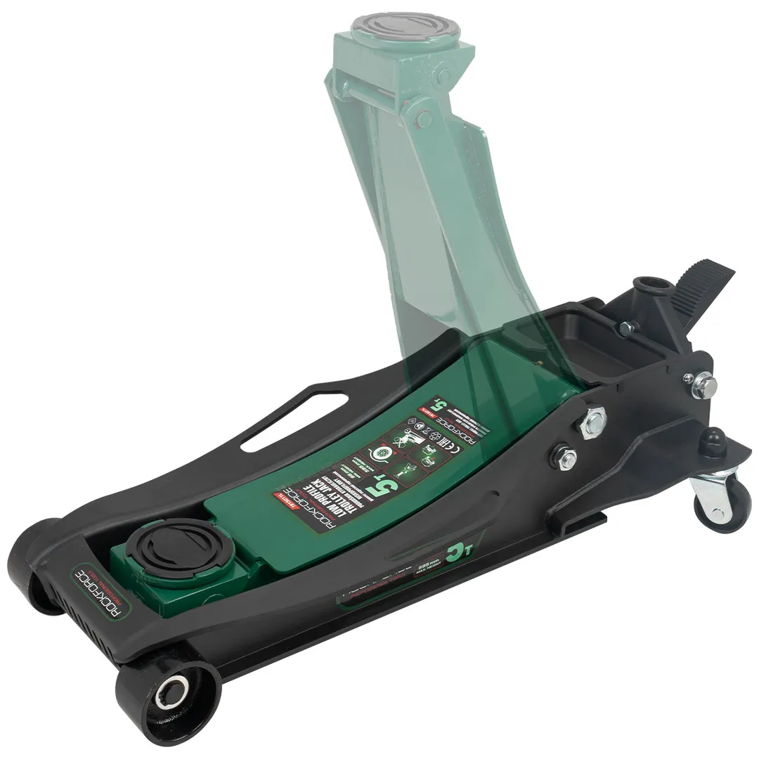 Гидравлический подкатной домкрат грузоподъемностью 5 тонны — это профессиональное оборудование для подъема транспортных средств при проведении ремонтных и сервисных работ. Домкрат обладает рабочим диапазоном высот от 96 мм до 595 мм, что позволяет работать с низкопрофильными автомобилями и внедорожниками. Конструкция оснащена двухсекционным гидравлическим насосом с системой безопасности против перегрузки и аварийным сбросом давления. Стальная рама с усиленными ребрами жесткости и полиамидными роликами обеспечивает устойчивость на поверхности с нагрузкой до 5 тонн. Опорная лапа из кованой стали с противоскользящим покрытием гарантирует фиксацию автомобиля в поднятом положении. Домкрат предназначен для использования на ровных твердых покрытиях с обязательным применением страховочных подставок. Вся продукция сертифицирована и соответствует требованиям безопасности при эксплуатации в автосервисах и частных мастерских.