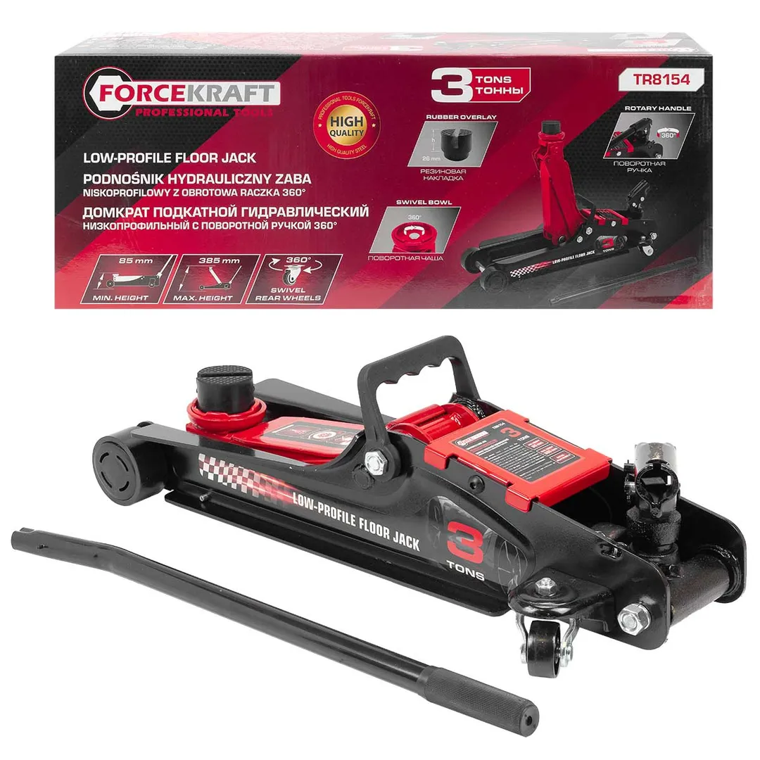 Домкрат подкатной гидравлический идеально подходит для ежедневного использования в автомастерской, на шиномонтаже или в гараже. Прочный гидравлический блок с поршневым насосом обеспечивает быстрый подъем автомобиля без особых усилий. Подъем и опускание можно легко регулировать. Мобильность и надежность: домкрат оснащен 2 фиксированными и 2 поворотными колесами, поэтому его можно легко перемещать. Благодаря предохранительному клапану домкрат соответствует стандарту безопасности. Особенность конструкции - низкий профиль: подходит для использования с низким клиренсом (спорткары и некоторые седаны); поворотная ручка обечспечивает удобство при работе в ограниченных пространствах. В комплекте прочная резиновая накладка, которая предотвращает от повреждения автомобиля: исключает возможность повредить кузов, предохраняет от самопроизвольного соскальзывания.