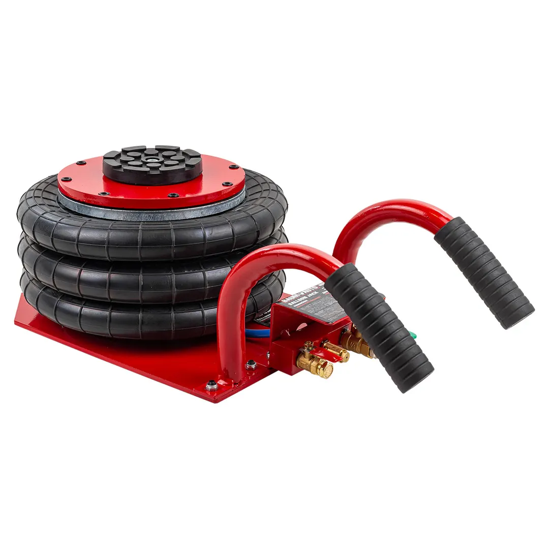 Домкрат автомобильный пневматический с грузоподъемностью до 3,5 тонн. Максимальная высота подъема 420 мм, уровень подхвата 135 мм. Позволяет производить быстрый демонтаж и установку колес легкового транспорта, а также необходимый местный ремонт подвески, узлов рулевого управления и тормозной системы. Домкрат подкатной имеет грузоподъемность 3,5 тонн и рассчитан на подключение к компрессору, подающему сжатый воздух под давлением от 6 до 12 бар. Устройство приводится в действие путем открытия крана подачи, расположенного на конце управляющей рукоятки. Конструкция данной модели включает три распорные резиновые подушки диаметром 270 мм.