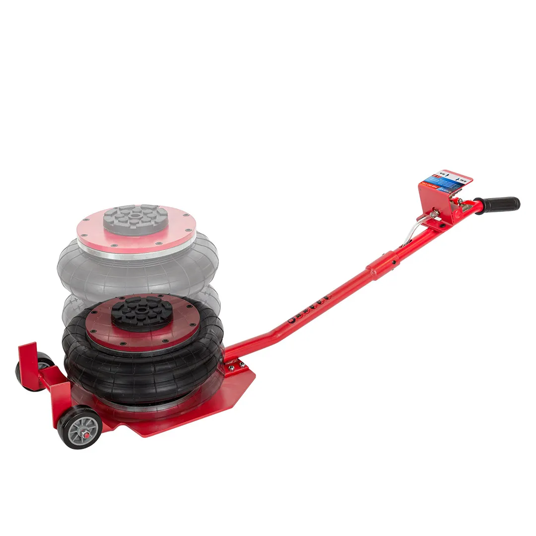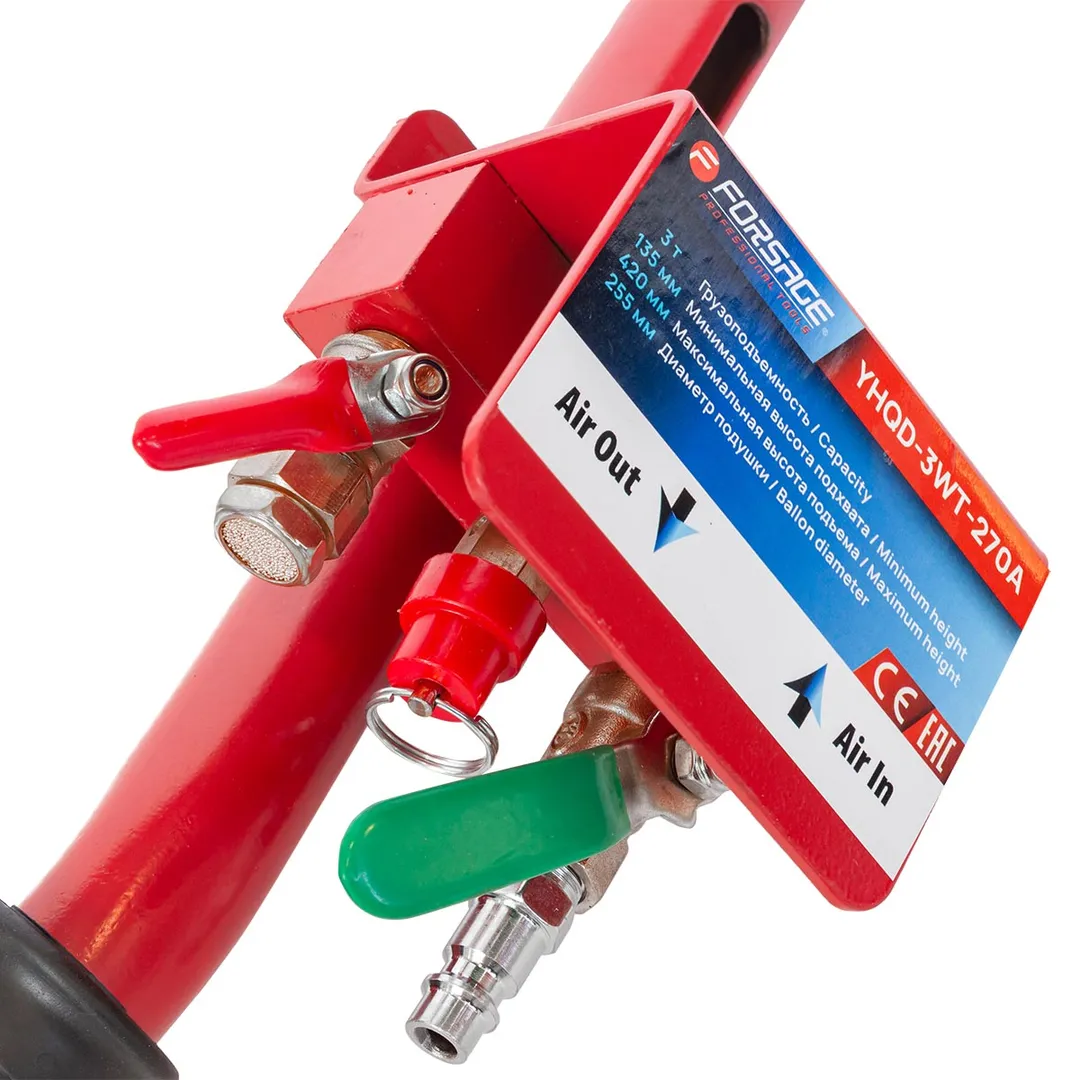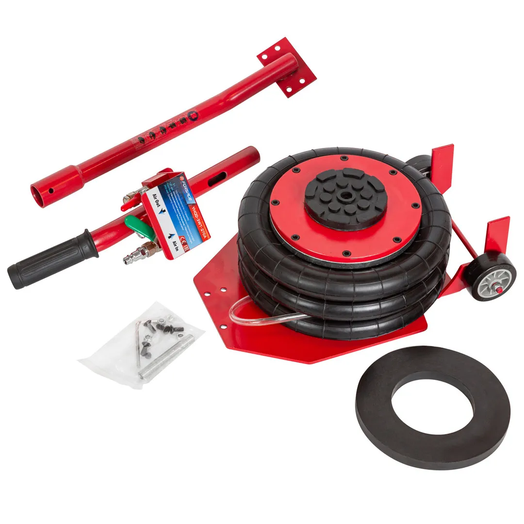 Профессиональный 3-камерный пневматический домкрат позволяет производить быстрый демонтаж и установку колес легковых автомобилей, а также необходимый местный ремонт подвески, узлов рулевого управления и тормозной системы. Домкрат подкатной пневматический имеет грузоподъемность 3 тонны и рассчитан на подключение к компрессору, подающему сжатый воздух под давлением от 6 до 12 бар. Устройство приводится в действие путем открытия крана подачи, расположенного на конце управляющей рукоятки. Конструкция данной модели включает три распорные резиновые подушки диаметром 270 мм, обеспечивающие максимальную высоту подъема объекта до 420 мм. Значение минимальной высоты подхвата (дорожный просвет автомобиля) составляет 135 мм. Если домкрат применяется в процессе ремонтных работ, поднятую сторону автомобиля следует зафиксировать при помощи дополнительных опор. Устройство рекомендовано для использования в гаражах, на СТО и в шиномонтажных мастерских.