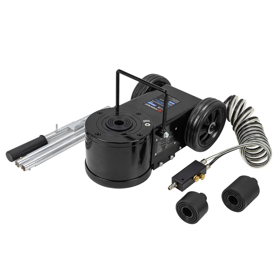 Домкрат пневмогидравлический подкатной - идеальный инструмент для проведении шиномонтажных и иных работ в автосервисах, мастерских, автобусных парках. Домкрат предназначен для подъема грузовых автомобилей, автобусов, строительной и другой крупной техники при проведении шиномонтажных и иных работ в автосервисах, мастерских, автобусных парках. Пневмогидравлический механизм подразумевает использование воздушного компрессора или другого источника сжатого воздуха для поднятия гидравлического поршня домкрата. Домкрат оснащен двухштоковым поршнем, и грузоподьемность домкрата зависит от степени поднятия штока. Ручка домкрата оборудована штуцером под быстросьем евротипа. Домкрат также оснащен сменными удлинителями длиной 45 и 75мм,что позволяет легко отрегулировать высоту в соответствии с потребностями.