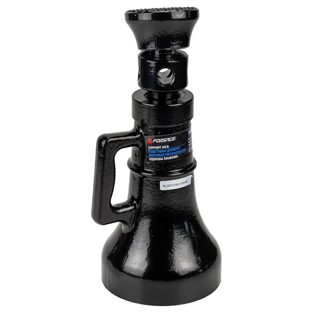 Домкрат-подставка винтовой механический с грузоподъемностью до 10 тонн. Высота подхвата 300 мм, максимальный уровень подъема 425 мм. Винтовой домкрат-подставка представляет несложную конструкцию, способную удерживать большие массы грузов. Принцип работы состоит из превращения крутящего момента в перемещение поступательное, основная конструкция состоит из винта, гайки и редуктора. Домкрат-подставка отличается своей высокой степенью надежности. Может быть использован при различных процессах, монтаж и демонтаж колес автомобилей, техническое обслуживание и диагностика машин, сжатие пружин и соответствующих механизмов, укладка труб.