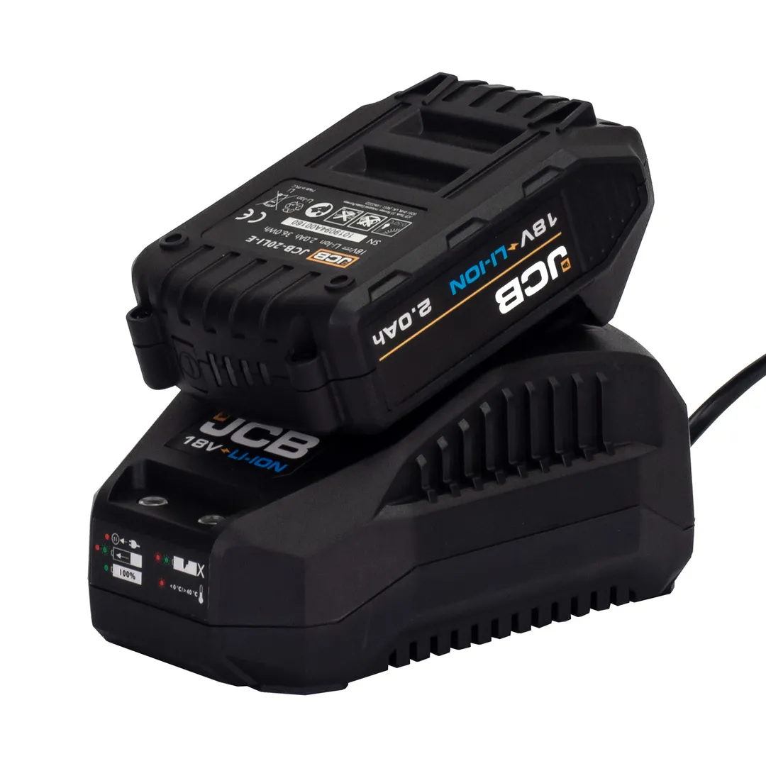 Поставляется с зарядным устройством (JCB-18VFC-E) 2.4 А и батарейным аккумулятором (JCB-20LI-E) 2.0AH.