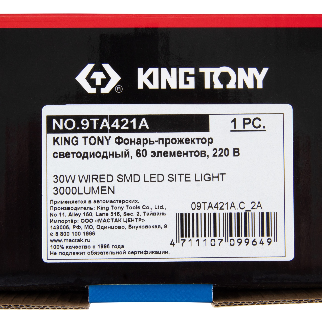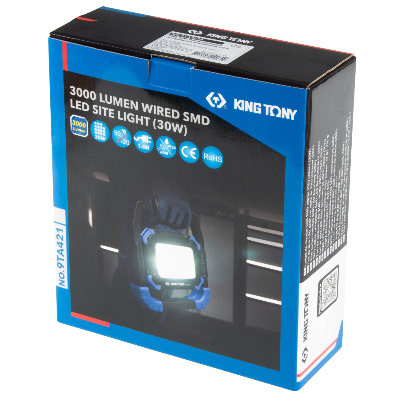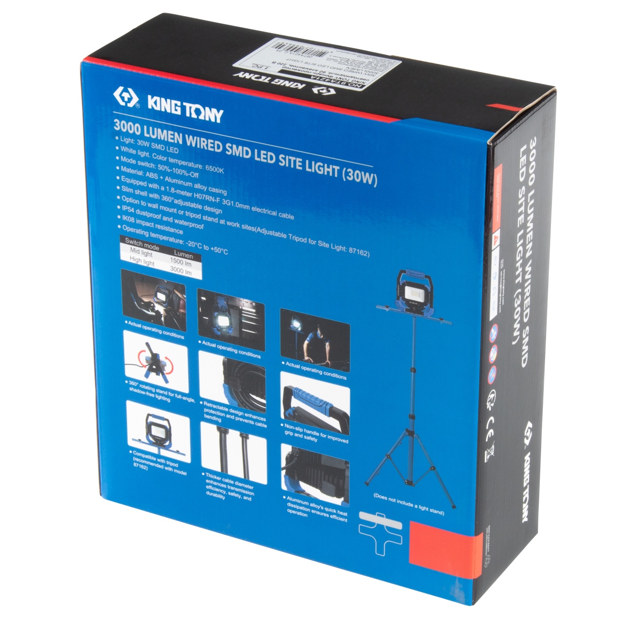 30W 60×SMD LED Световая температура 6500K Режимы работы 1500 люмен (50%) / 3000 люмен (100%) / Выкл. Размер световой платы 45×25 мм Питание AC 220-240В, 50Гц Длина кабеля 1,8 м Класс водонепроницаемости IP54 Класс защиты от механических воздействий IK08 Рабочая температура от –20° C до +50° C Материалы Пластик ABS (корпус), алюминий (рефлектор), акрил (защитное стекло), резина (кабель) Индивидуальная упаковка Картонный короб в фирменном стиле бренда KING TONY Размеры в упаковке 247×90×280 мм Вес нетто / брутто 1,393 кг / 1,593 кг