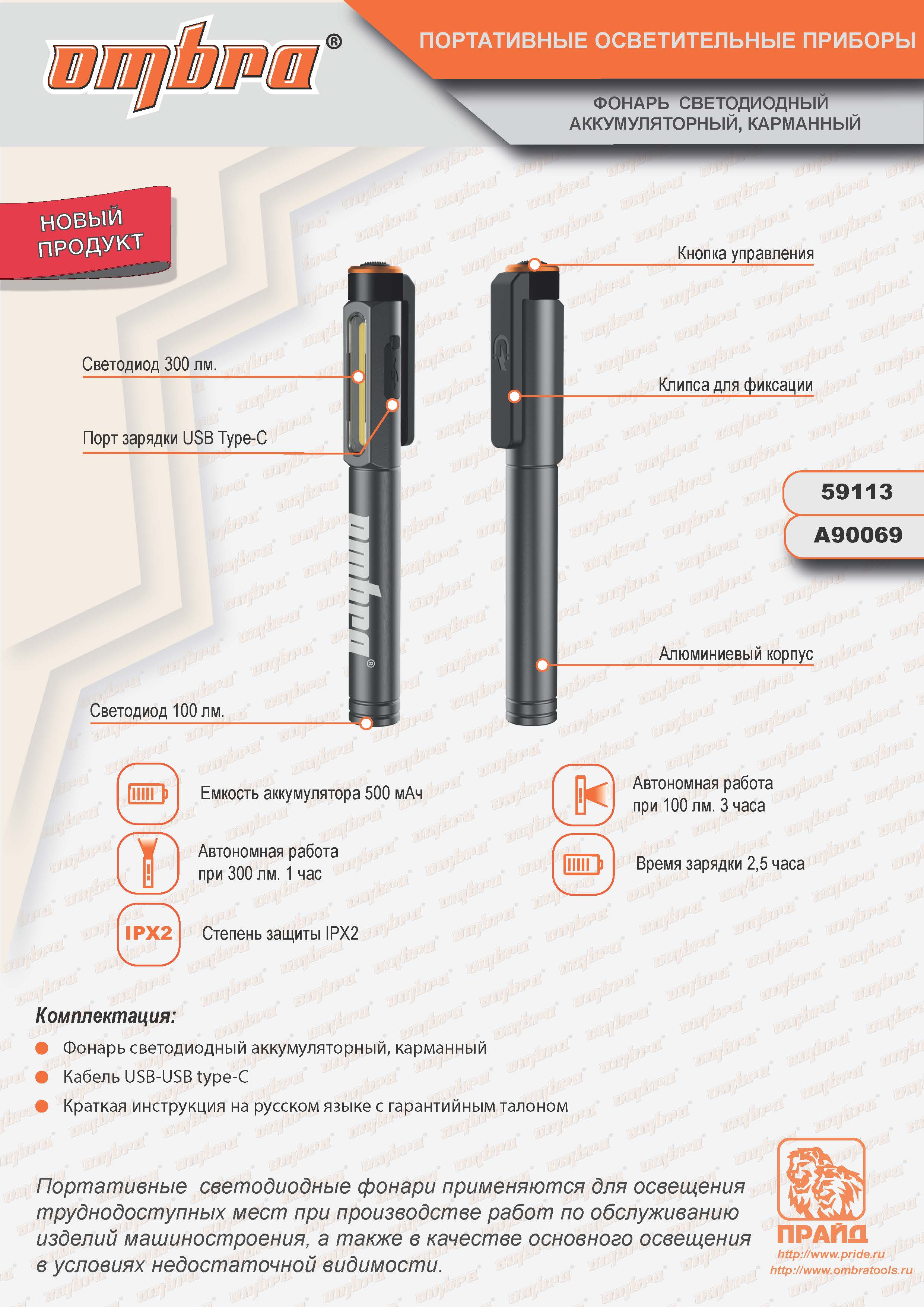 Время работы: 1 час при 300 лм, 3 часа при 100 лм.
