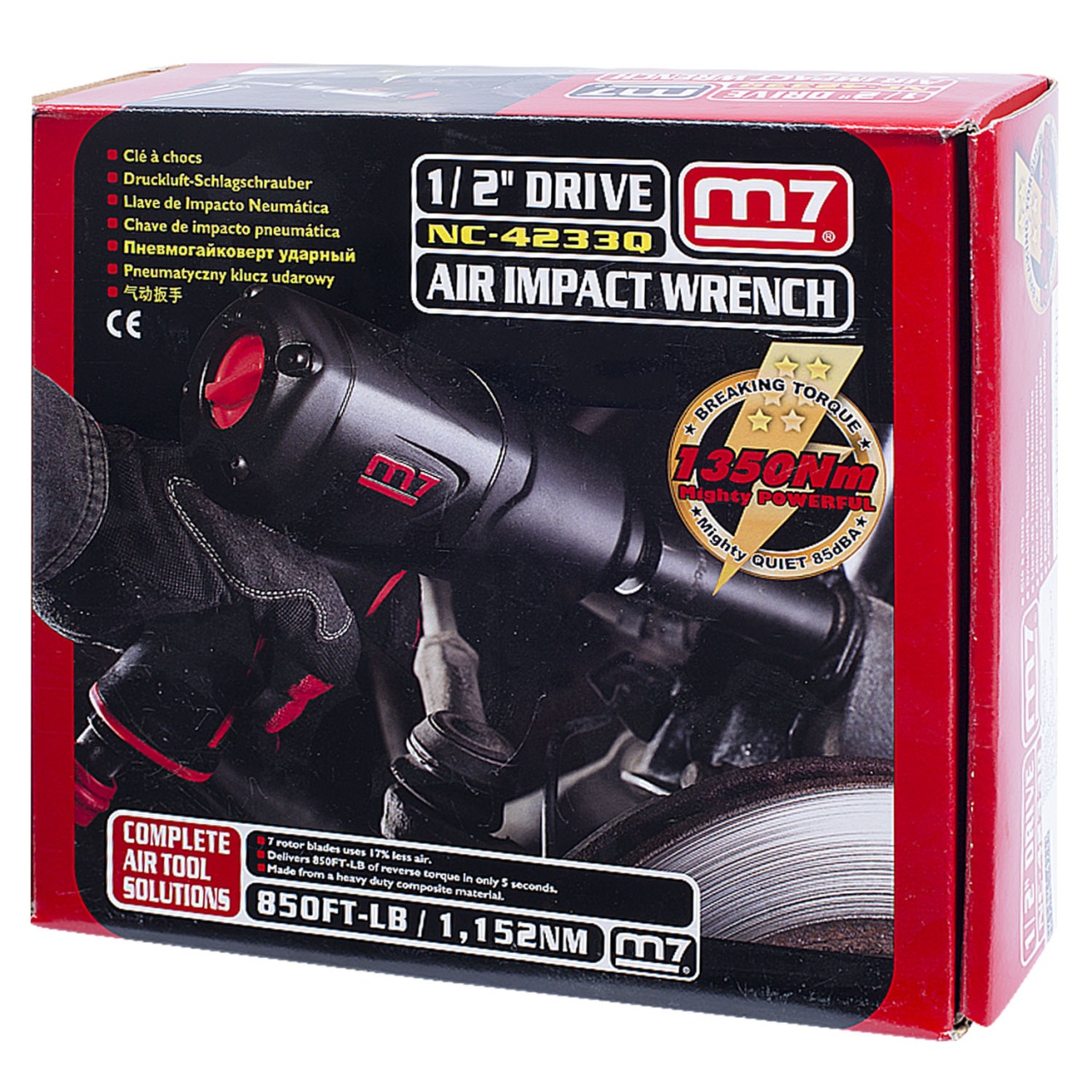 1/2" Максимальное усилие REVERSE 1152 Нм Диапазон усилий FORWARD 271-678 Нм Скорость свободного вращения 6500 об/мин Тип оси Стандартная Длина оси — Общая длина по оси 190 мм Режимы работы FORWARD ×3 / REVERSE Тип переключателя Дисковый, расположен на задней части корпуса Тип включателя Кнопочный Тип ударного механизма Twin Hammer Питание Сжатый воздух Рабочее давление 6,3 бар Средний расход воздуха 132 л/мин Рекомендованное сечение шланга 10 мм Резьба на входе F1/4" Уровень шума 85,0 дБ Вибрация 4,40 м/с2 Материалы Инструментальная сталь Cr-Mo (ударный механизм), алюминиевый сплав, сталь, композиты (корпус), пластик Упаковка Картонный короб в фирменном стиле бренда MIGHTY SEVEN Размеры в упаковке 200×185×65 мм Вес 2,10 кг