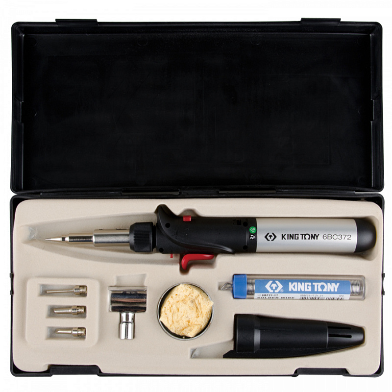 тип инструмента / наименование серия / артикул размер / количество Горелка газовая, паяльник 6BC372 257 мм Насадка коническая 6BC372-1 22,5 мм Насадка тонкая 6BC372-2 2,5 × 30 мм Насадка 2-сторонний скос 6BC372-3 3,5 × 22 мм Насадка 1-сторонний скос 6BC372-4 4,5 × 22 мм Насадка рефлектор 6BC372-5 37,5 × 28 мм Припой в пластиковой колбе 6BF21-17 олово 99,3%, медь 0,7%, Ø1 мм Вспененный канифоль в металлической чаше - Ø40 × 15 мм Защитный пластиковый кожух - 95 мм Пластиковый кейс - 280 х 140 х 40 мм