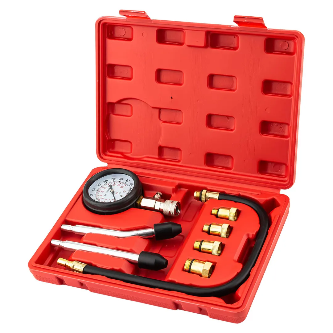 Набор с индикатором компрессии бензинового двигателя из 8 предметов, в кейсе - это прибор, который позволяет измерить давление в цилиндрах двигателя автомобиля. Он состоит из манометра, жесткого прижимного адаптера-переходника и набора адаптеров для различных типов двигателей. Манометр имеет диапазон измерений от 0 до 20 бар и точность измерения ±0,25 бар. Жесткий прижимной адаптер обеспечивает надежное крепление индикатора на двигателе и предотвращает его смещение во время измерения. Набор адаптеров позволяет использовать индикатор для различных типов бензиновых двигателей, включая двигатели с резьбой М10, М12, М14, М18 + 2 жестких прижимных адаптера-переходника. Каждый адаптер имеет свою резьбу и подходит только для определенного типа двигателя. Компрессометр бензинового двигателя поставляется в кейсе для удобства хранения и транспортировки. Он является необходимым инструментом для диагностики и обслуживания бензиновых двигателей и позволяет быстро и точно измерить давление в цилиндрах.