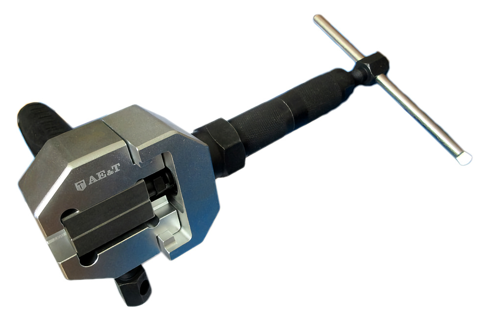 Прорезиненная рукоять. Винт (под вороток) для фиксации зажимов в корпусе для зажимов. Давящий цилиндр (под вороток). Вороток (150 мм). Корпус для зажимов из двух половинок. Инструмент для снятия заусенцев и внутренней фаски.
