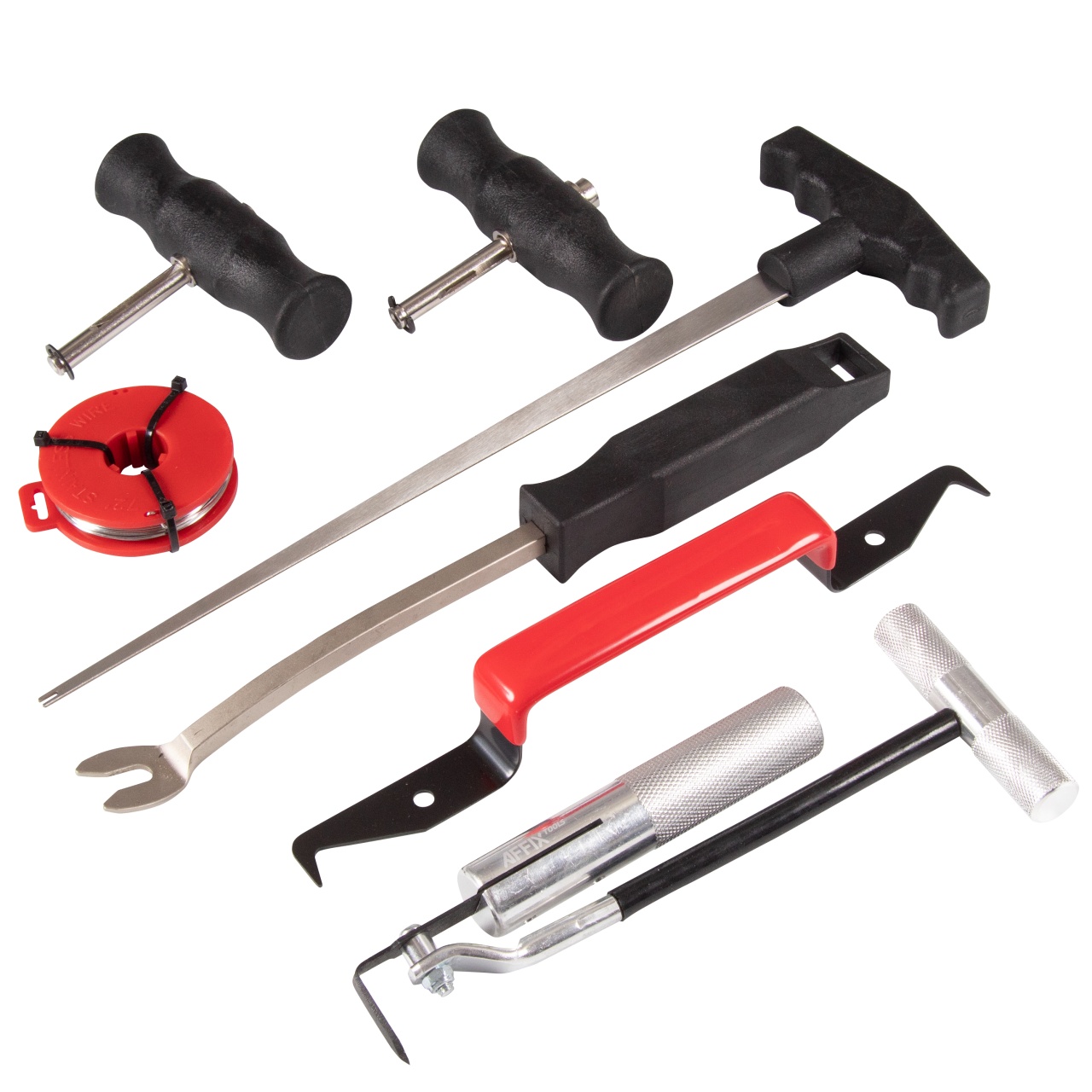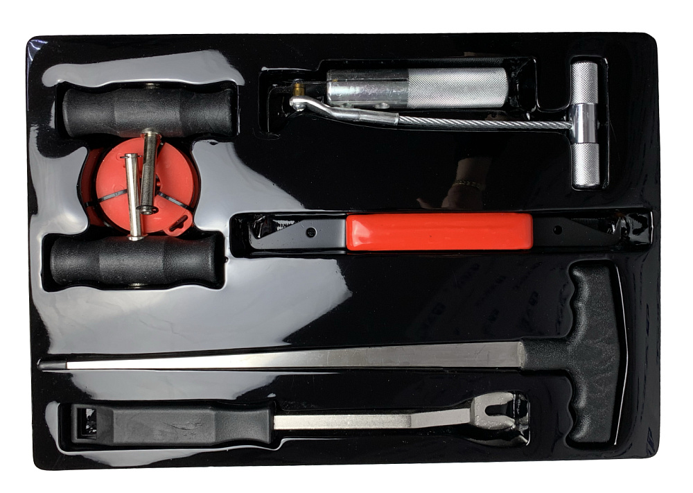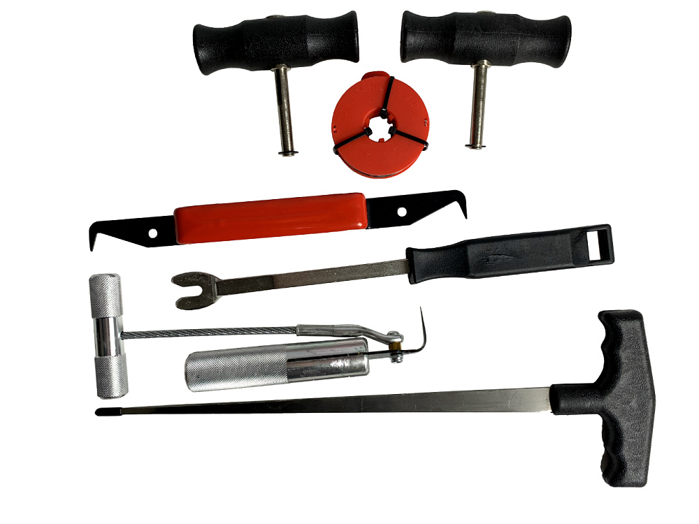 В комплект входят: нож резиновых уплотнений, струна, рукоятки 2шт, катушка с проволокой, инструмент для демонтажа обшивки, инструмент для снятия молдингов.