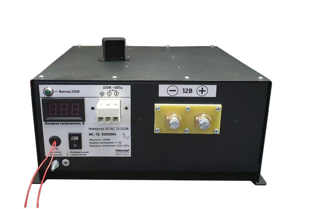 Инвертор ИС-12-3000М4 (преобразователь напряжения) преобразует постоянное напряжение аккумулятора 12 В в переменное синусоидальное напряжение 220 В и частотой 50 Гц. Качественные характеристики такого напряжения аналогичны характеристикам напряжения в бытовой сети.