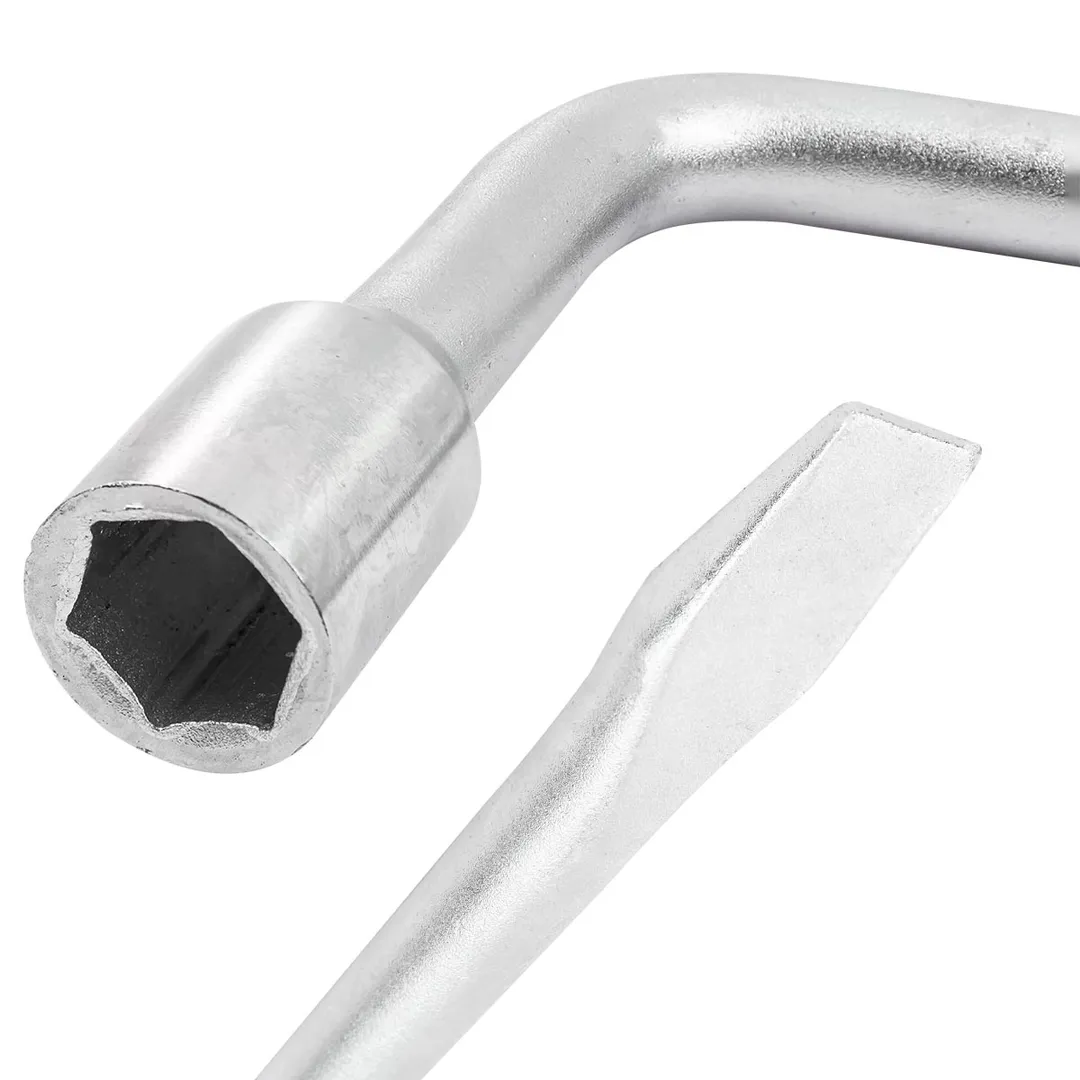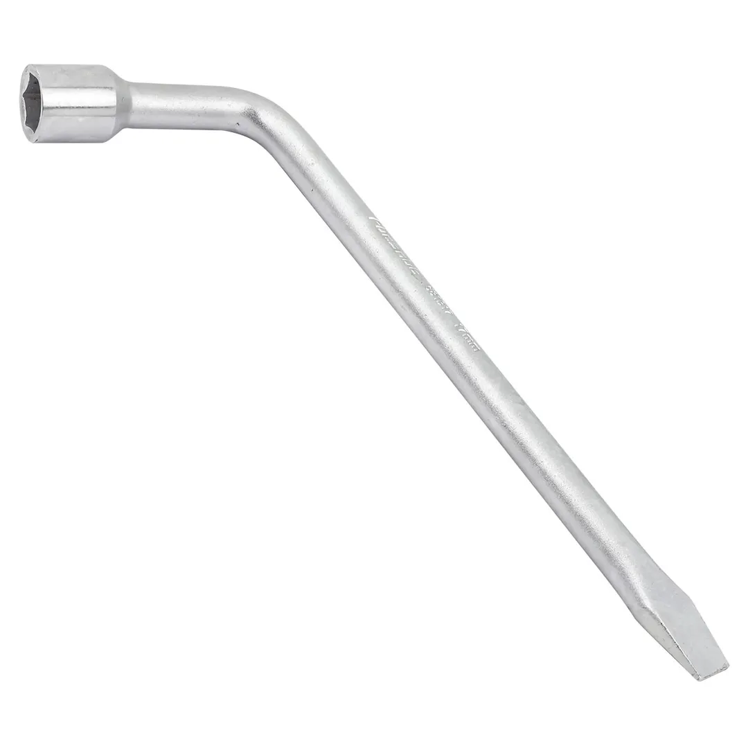 Ключ балонный Г-образный 17мм (диаметр 16мм) L-300мм является необходимым и даже незаменимым инструментом для ремонта колеса. Баллонным ключом называется гаечный ключ торцового типа, которым откручивают или закручивают гайки при работе с автомобильными колесами. С помощью него водитель сможет самостоятельно поменять колесо, затянуть и установить крепёж (болты, гайки). Данный инструмент изогнут практически на 90 градусов, что обеспечивает больший крутящий момент. С одной стороны Г-образного ключа расположена торцевая головка , с другой - монтажная лопатка, которая используется при разбортировании колеса, а также как монтировка. Ключ можно также применять и при сборке различных конструкций с применение болтовых (резьбовых) соединений, при ремонте других деталей авто. Гаечный ключ пригоден для использования как в собственном гараже и в быту, так и на специализированной СТО.