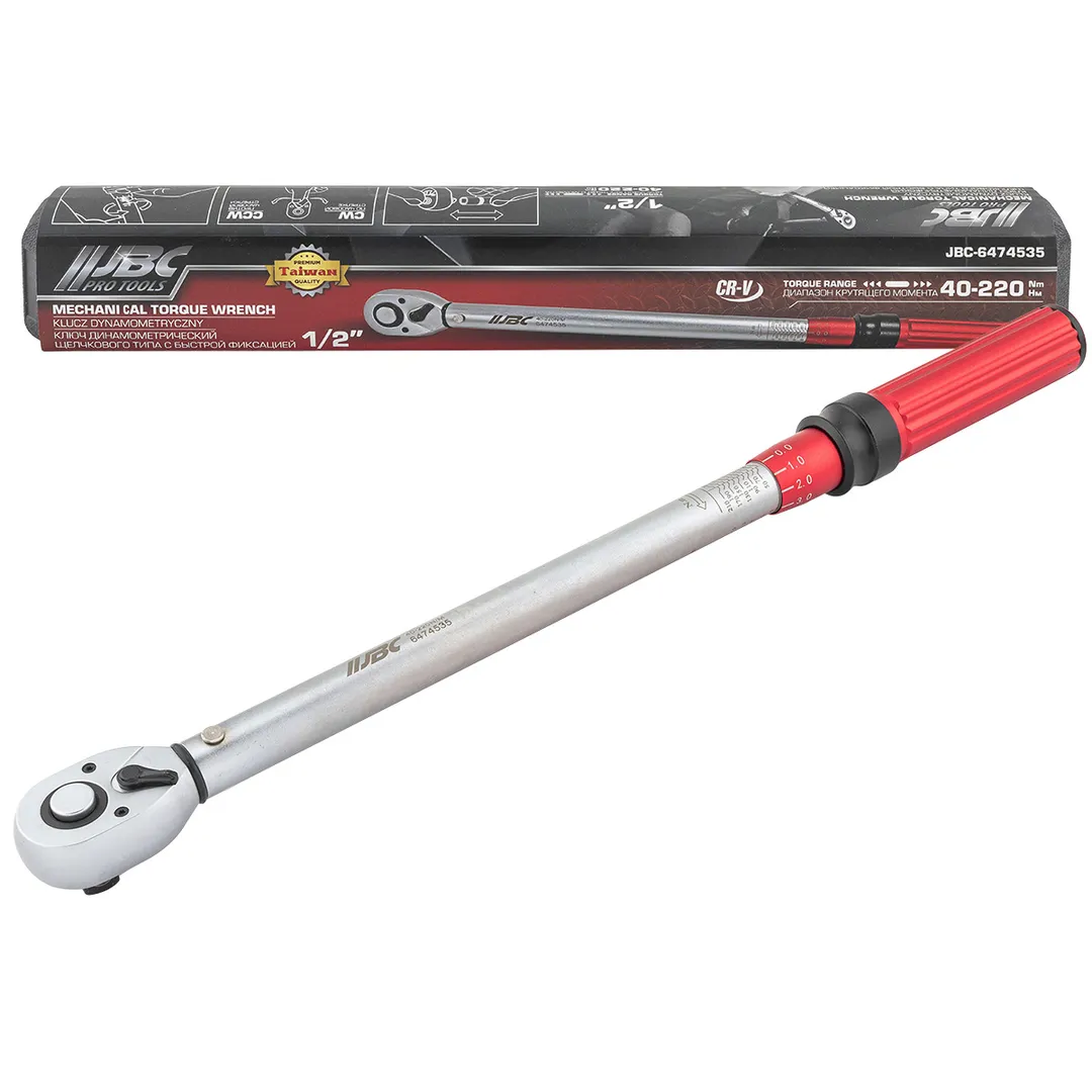 Динамометрический ключ щелчкового типа JBC с быстрой фиксацией и посадочным квадратом 1/2" предназначен для точной затяжки резьбовых соединений с контролируемым усилием в диапазоне 40-220Нм. При достижении установленного момента ключ издаёт характерный щелчок, что обеспечивает надёжную индикацию правильной затяжки и предотвращает повреждение деталей. Быстросъёмная головка и реверсивный храповой механизм позволяют удобно работать и оперативно менять насадки. Инструмент подходит для использования в автосервисе, бытовой техники, велосипедов и в других областях, где требуется точное соблюдение крутящего момента.