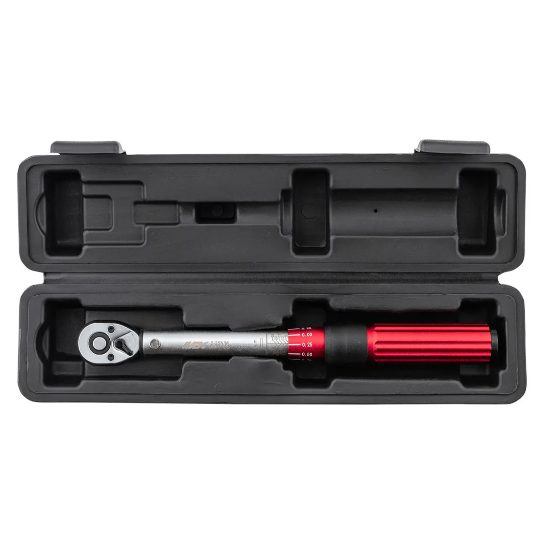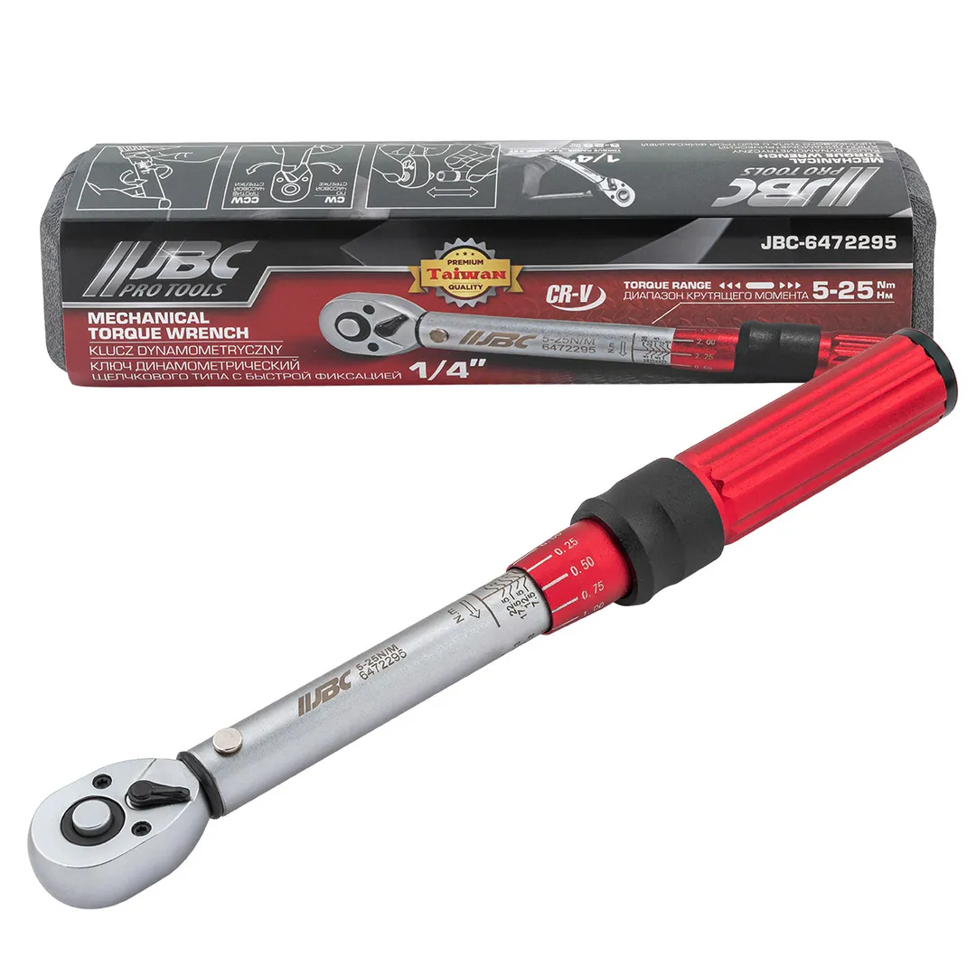 Динамометрический ключ щелчкового типа JBC с быстрой фиксацией и посадочным квадратом 1/4" предназначен для точной затяжки резьбовых соединений с контролируемым усилием в диапазоне 5-25Нм. При достижении установленного момента ключ издаёт характерный щелчок, что обеспечивает надёжную индикацию правильной затяжки и предотвращает повреждение деталей. Быстросъёмная головка и реверсивный храповой механизм позволяют удобно работать в ограниченном пространстве и оперативно менять насадки. Инструмент подходит для использования в автосервисе, бытовой техники, велосипедов и в других областях, где требуется точное соблюдение крутящего момента.