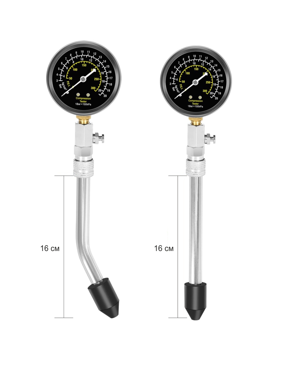 Компрессометр бензиновый с двумя жесткими удлинителями предназначен для измерения компрессии (давления) в цилиндропоршневой группе двигателей с бензиновым впрыском. Компрессометр оснащен игольчатым клапаном для сброса давления, гибким шлангом в комплекте со штуцером и трубчатой стойкой с резиновым уплотнением (для измерения давления путем удерживания компрессометра).