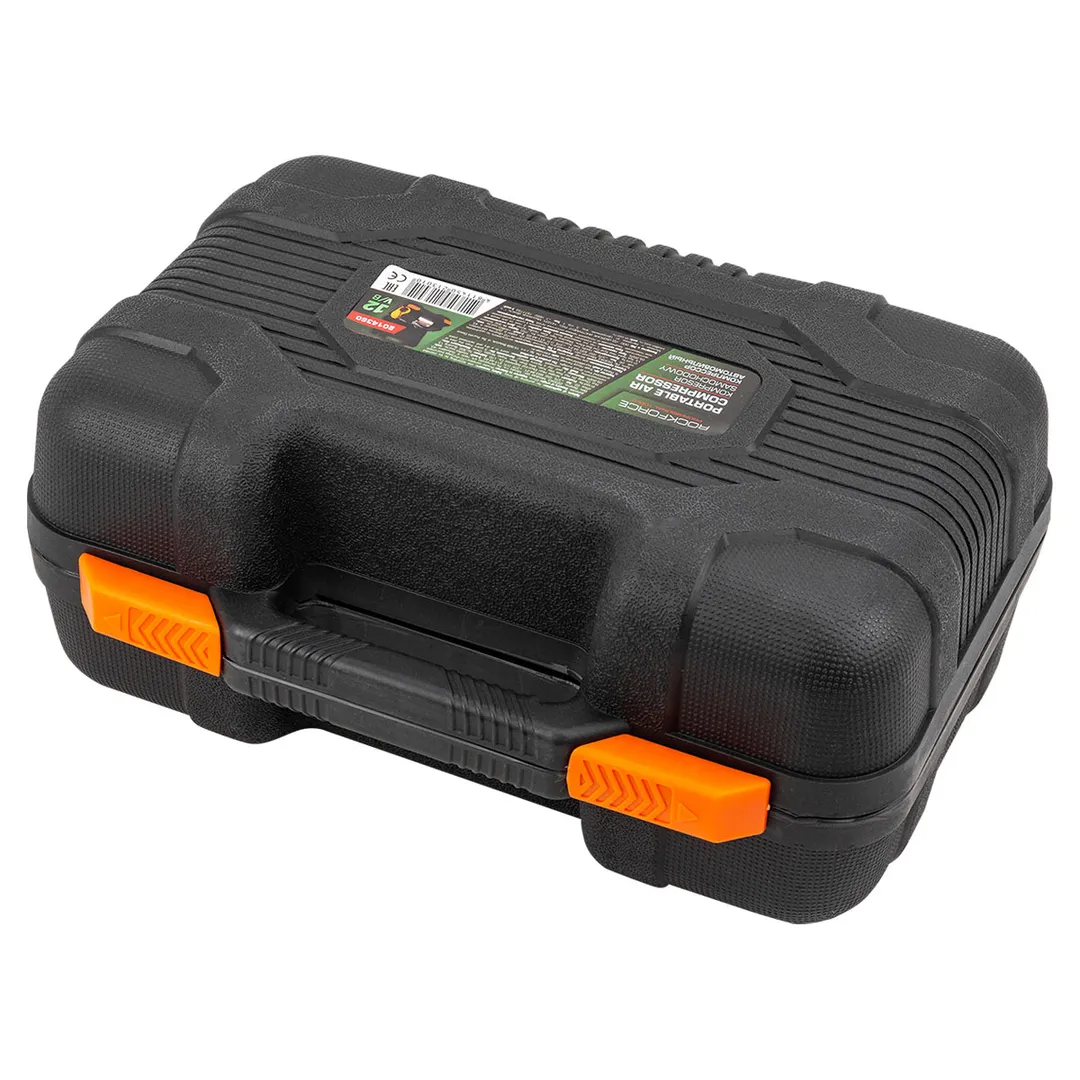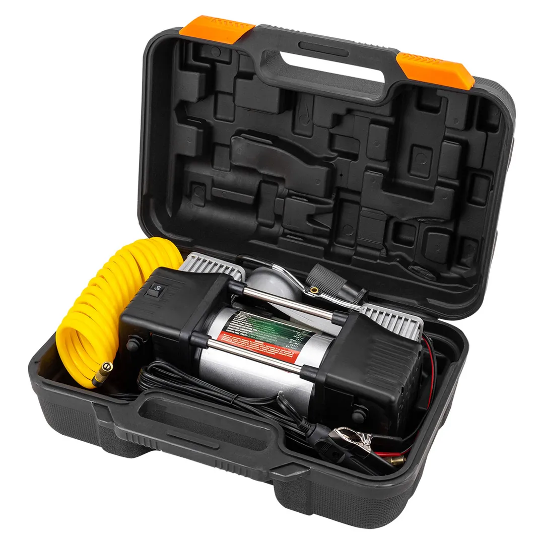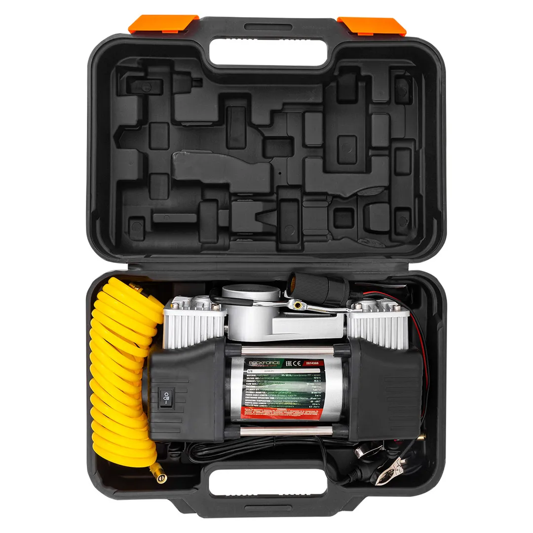 Компрессор поршневой автомобильный двухцилиндровый в пластиковом кейсе с аналоговым манометром - это лучшее решение для быстрой и удобной подкачки шин в дорожных условиях. Насос рассчитан на длительную эксплуатацию в различных климатических условиях. Компрессор оснащен встроенным фонариком, что позволяет использовать его в условиях пониженной освещенности. Прочный пластиковый кейс дает возможность удобно переносить и хранить компрессор, а также надежно защищает его от различных механических повреждений. В комплекте представлены не только сам поршневой двухцилиндровый компрессор, но и воздушный шланг, а также различные сменные насадки, что позволяет использовать насос также и для накачки резиновых лодок, мячей и надувных матрасов.
