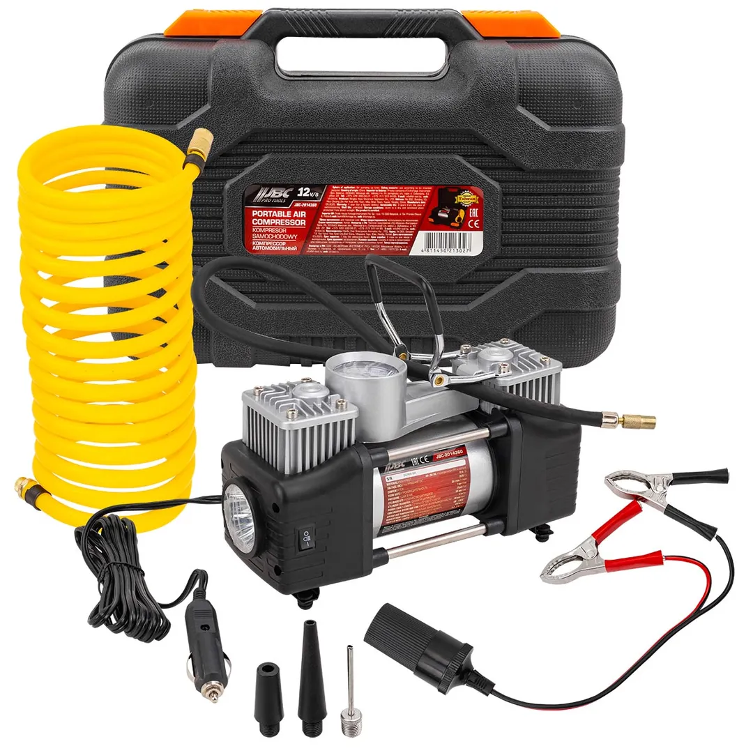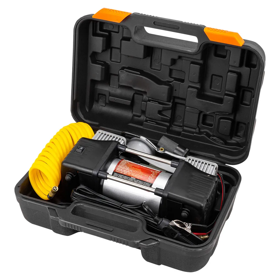 Компрессор поршневой автомобильный двухцилиндровый в пластиковом кейсе с аналоговым манометром - это лучшее решение для быстрой и удобной подкачки шин в дорожных условиях. Насос рассчитан на длительную эксплуатацию в различных климатических условиях. Компрессор оснащен встроенным фонариком, что позволяет использовать его в условиях пониженной освещенности. Прочный пластиковый кейс дает возможность удобно переносить и хранить компрессор, а также надежно защищает его от различных механических повреждений. В комплекте представлены не только сам поршневой двухцилиндровый компрессор, но и воздушный шланг, а также различные сменные насадки, что позволяет использовать насос также и для накачки резиновых лодок, мячей и надувных матрасов.