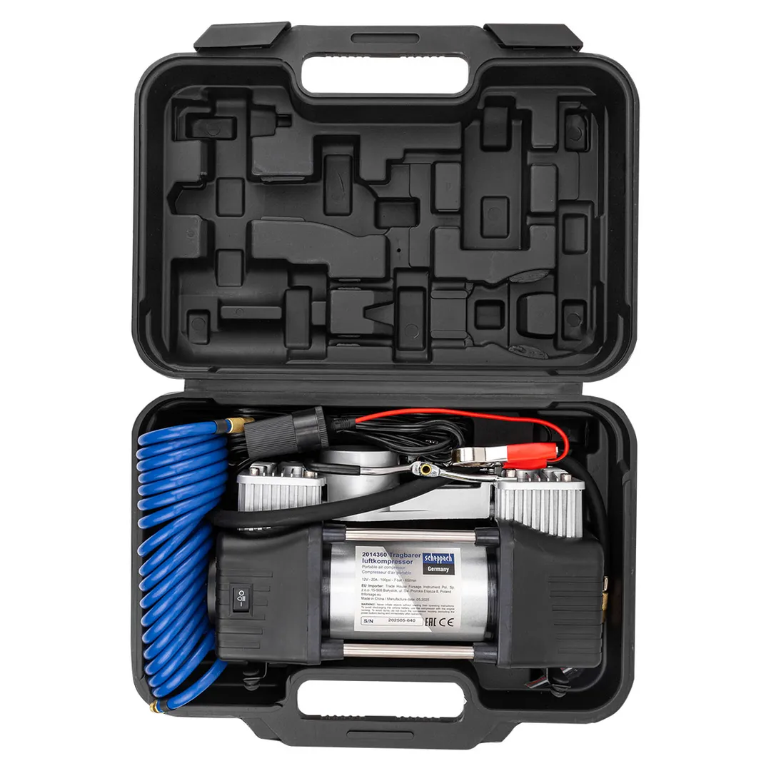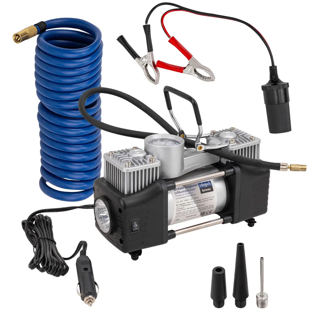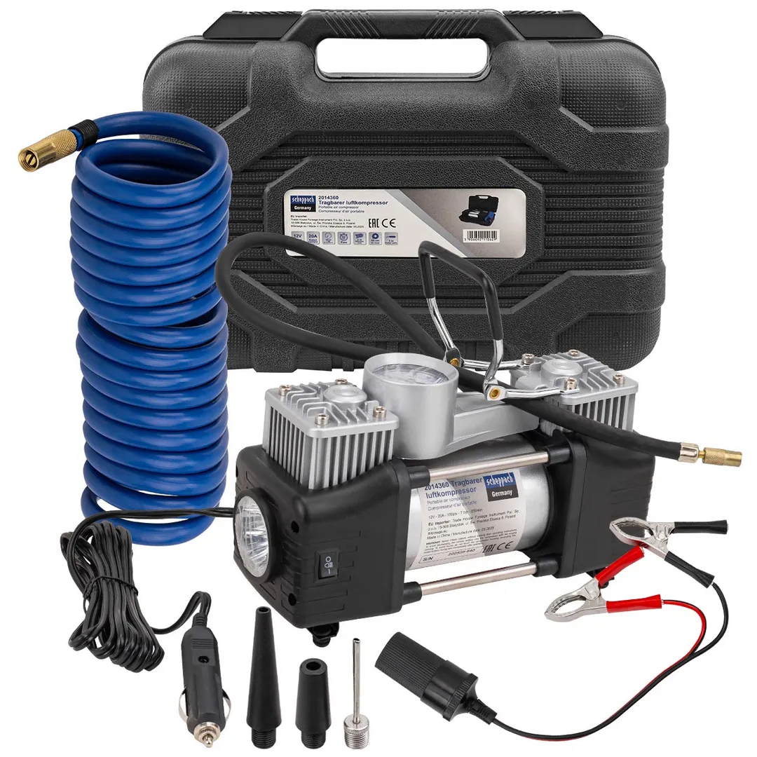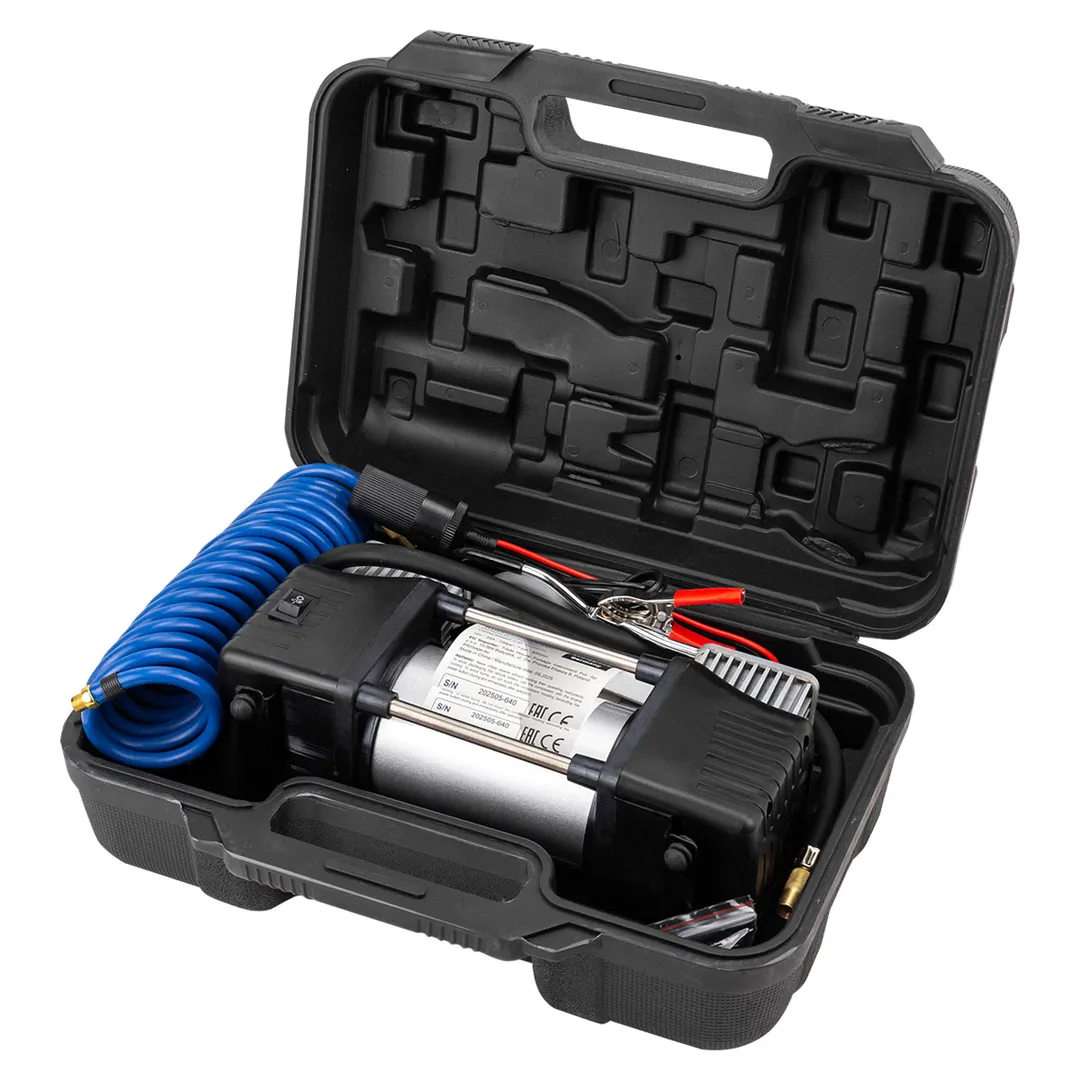 Компрессор поршневой автомобильный двухцилиндровый в пластиковом кейсе с аналоговым манометром - это лучшее решение для быстрой и удобной подкачки шин в дорожных условиях. Насос рассчитан на длительную эксплуатацию в различных климатических условиях. Компрессор оснащен встроенным фонариком, что позволяет использовать его в условиях пониженной освещенности. Прочный пластиковый кейс дает возможность удобно переносить и хранить компрессор, а также надежно защищает его от различных механических повреждений. В комплекте представлены не только сам поршневой двухцилиндровый компрессор, но и воздушный шланг, а также различные сменные насадки, что позволяет использовать насос также и для накачки резиновых лодок, мячей и надувных матрасов.