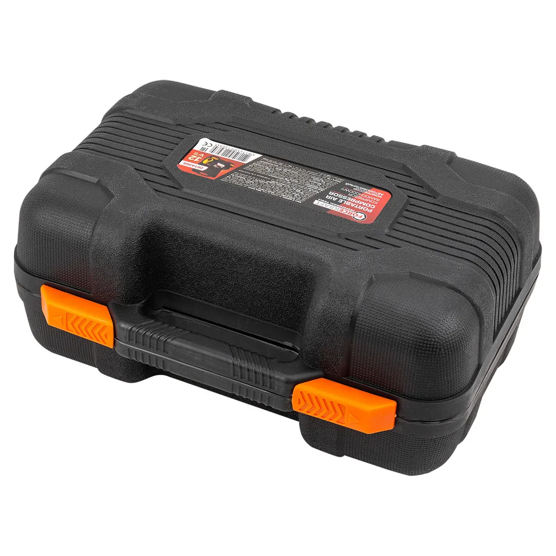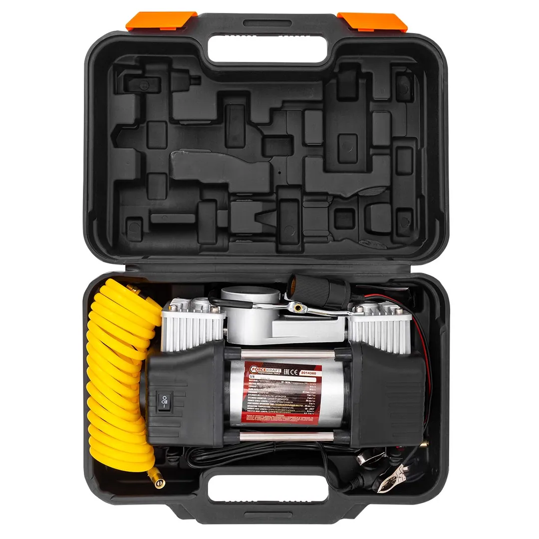Компрессор поршневой автомобильный двухцилиндровый в пластиковом кейсе с аналоговым манометром - это лучшее решение для быстрой и удобной подкачки шин в дорожных условиях. Насос рассчитан на длительную эксплуатацию в различных климатических условиях. Компрессор оснащен встроенным фонариком, что позволяет использовать его в условиях пониженной освещенности. Прочный пластиковый кейс дает возможность удобно переносить и хранить компрессор, а также надежно защищает его от различных механических повреждений. В комплекте представлены не только сам поршневой двухцилиндровый компрессор, но и воздушный шланг, а также различные сменные насадки, что позволяет использовать насос также и для накачки резиновых лодок, мячей и надувных матрасов.