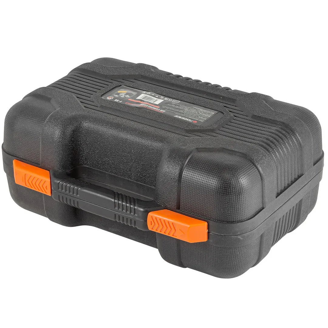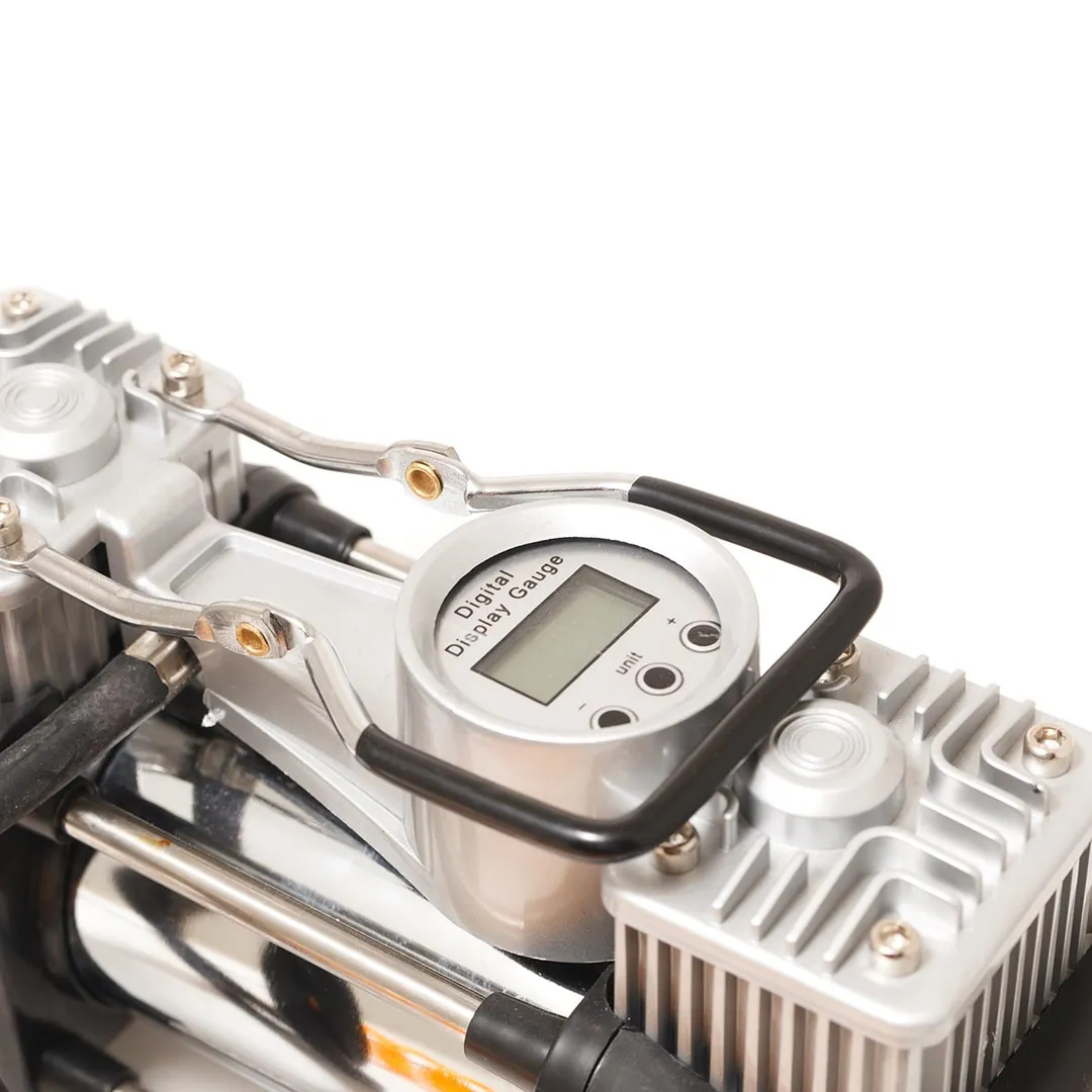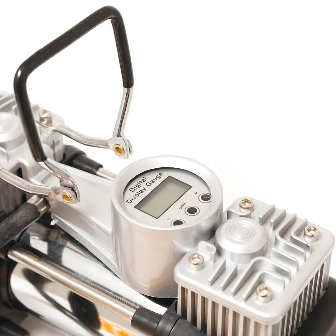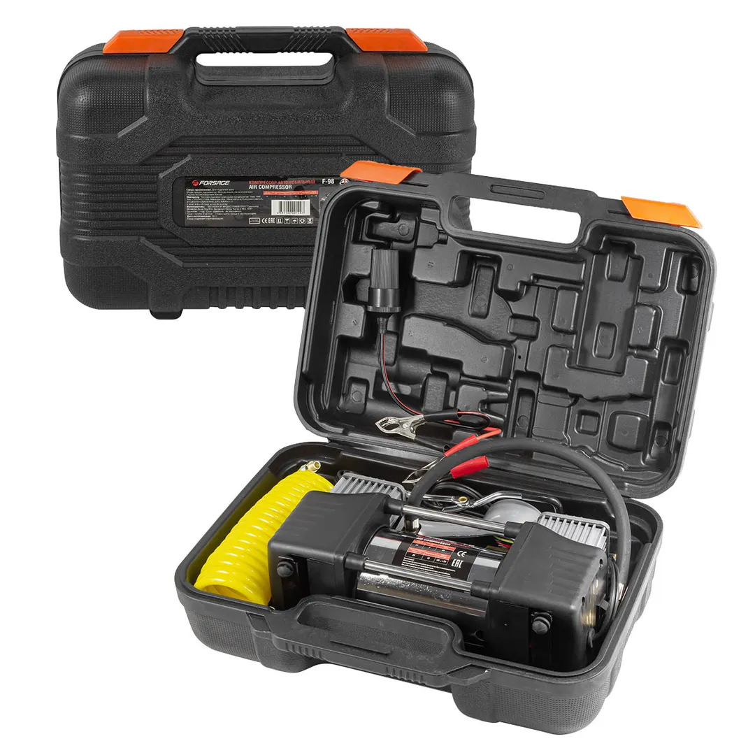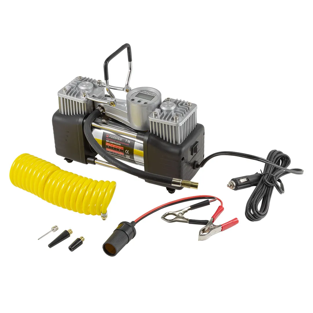 Компрессор поршневой автомобильный двухцилиндровый в пластиковом кейсе с цифровым манометром - это лучшее решение для быстрой и удобной подкачки шин в дорожных условиях. Металлические составляющие компрессора и подшипники изготовлены из металла, а это означает, что поршневой автомобильный компрессор прослужит вам долго и надежно. Насос рассчитан на длительную эксплуатацию в различных климатических условиях. Автомобильный компрессор обеспечен производительностью в 65л/мин, напряжением 12 В и силой тока 23А. Прочный пластиковый кейс дает возможность удобно переносить и хранить компрессор, а также надежно защищает его от различных механических повреждений. В комплекте представлены не только сам поршневой двухцилиндровый компрессор, но и воздушный шланг, а также различные сменные насадки, что позволяет использовать насос также и для накачки резиновых лодок, мячей и надувных матрасов.