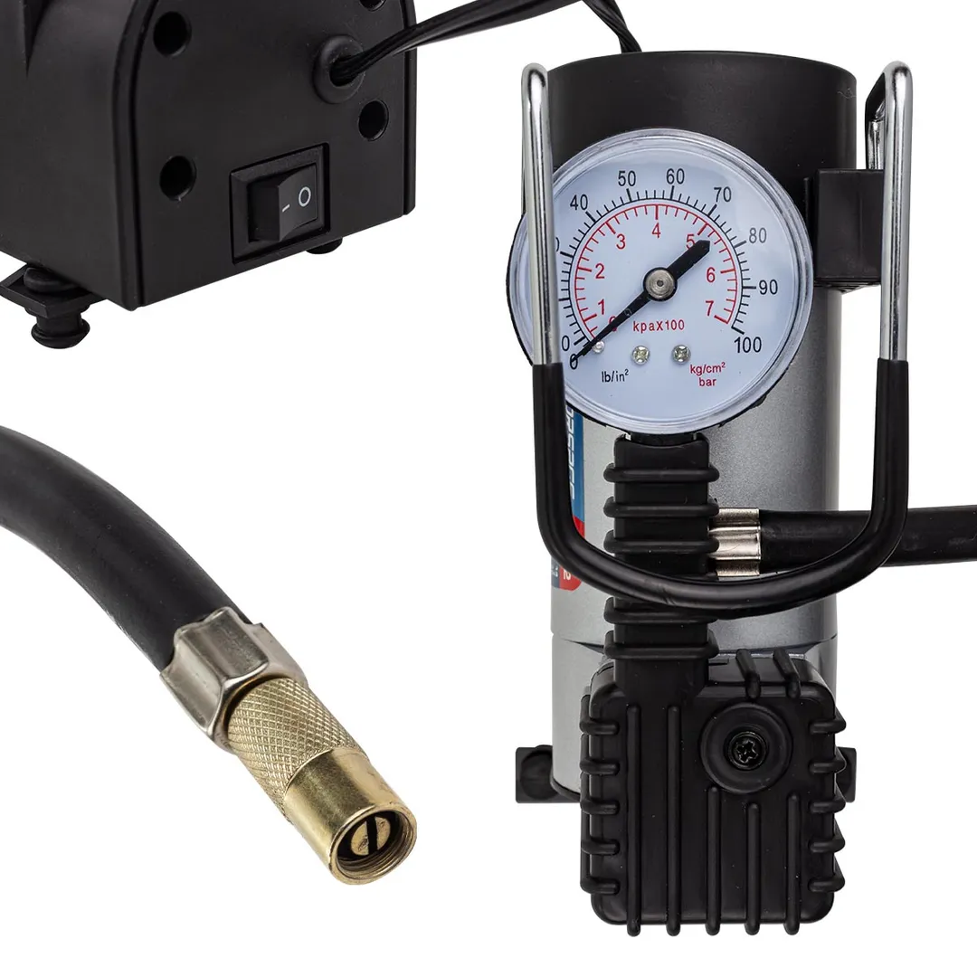 Автомобильный поршневой компрессор - незаменимый инструмент, который поможет вам путешествовать с комфортом. Основные детали корпуса и подшипники выполнены из металла, обеспечивая надежность и длительный срок службы поршневого компрессора. В комплекте есть 3 сменные насадки для подкачки резиновых лодок, надувных матрасов и мячей. Штуцер на шланге винтовой высокого давления. В комплект также входит тканевая сумка для удобной транспортировки и хранения компрессора, а также для защиты от механических повреждений.