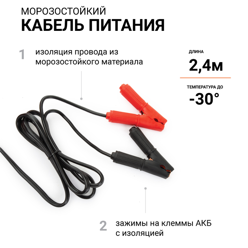 Кабель питания покрыт морозостойкой изоляцией, длина кабеля - 2,4 метра. Для защиты от перегрузок по току и короткого замыкания в компрессоре установлен специальный автоматический выключатель.