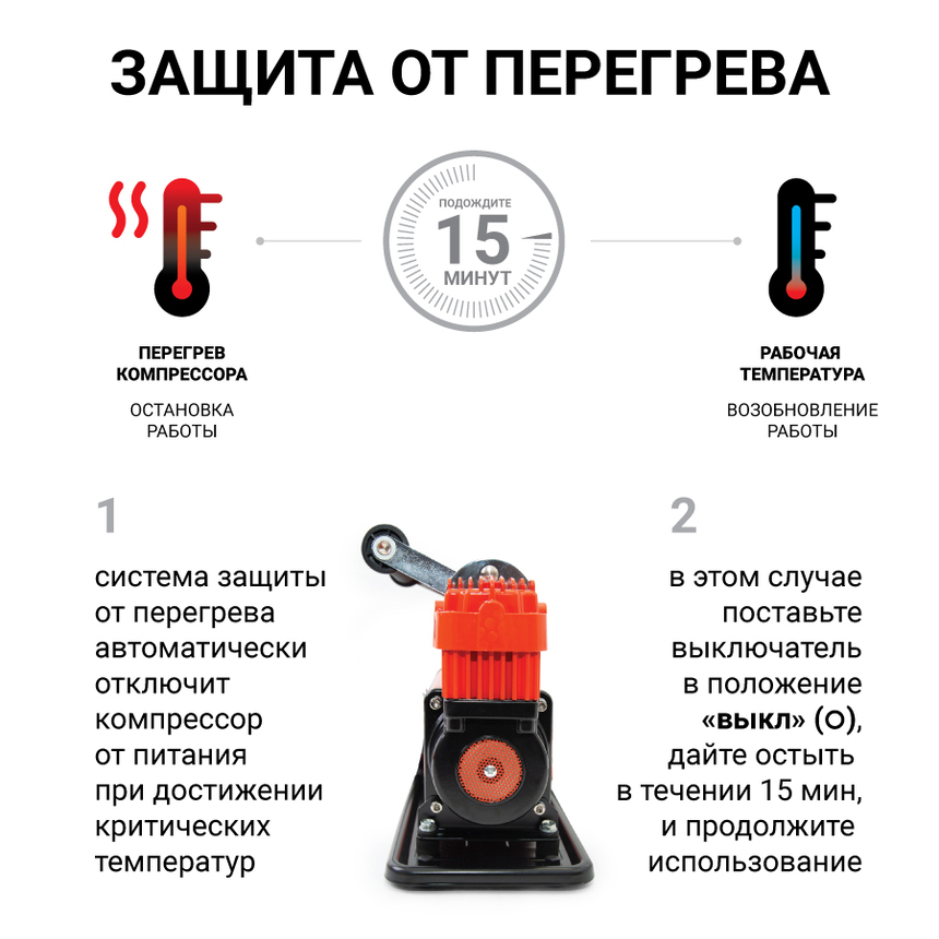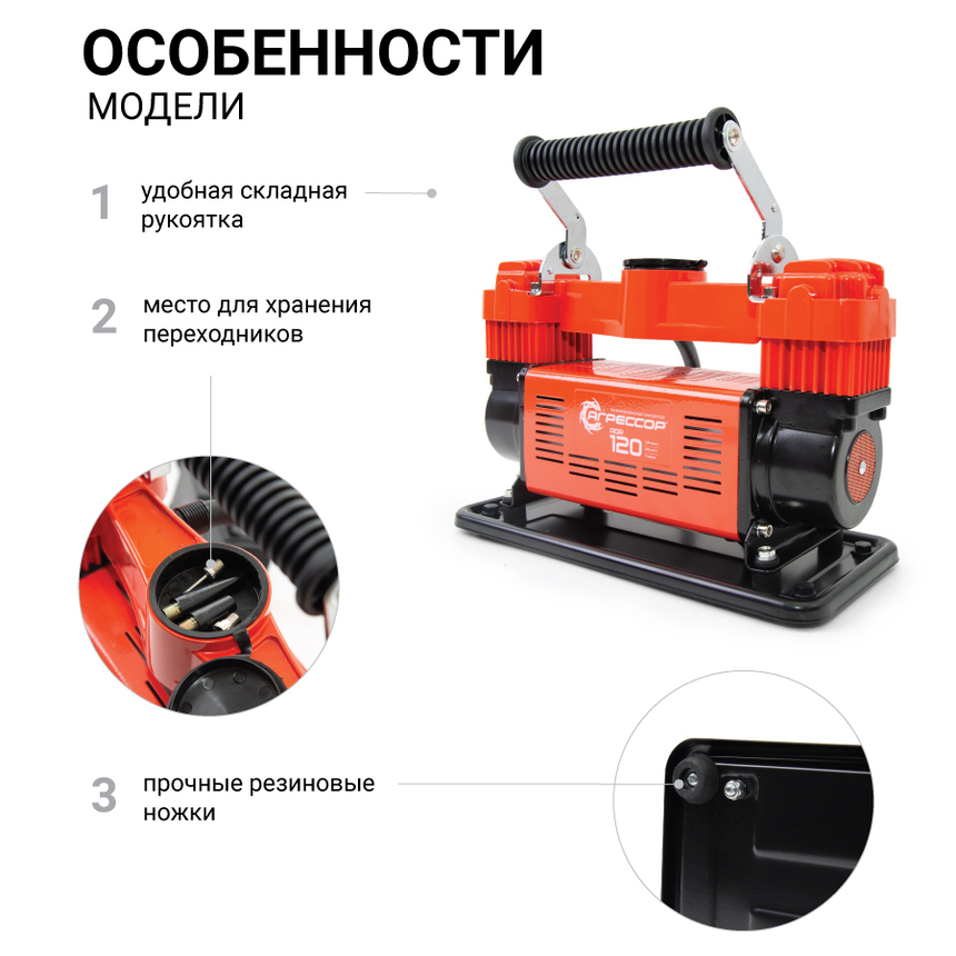 AGR-120 имеет встроенную защиту от перегрева - такая функция не позволит компрессору выйти из строя при несоблюдении рекомендуемого времени непрерывной работы или при работе в условиях повышенных нагрузок.