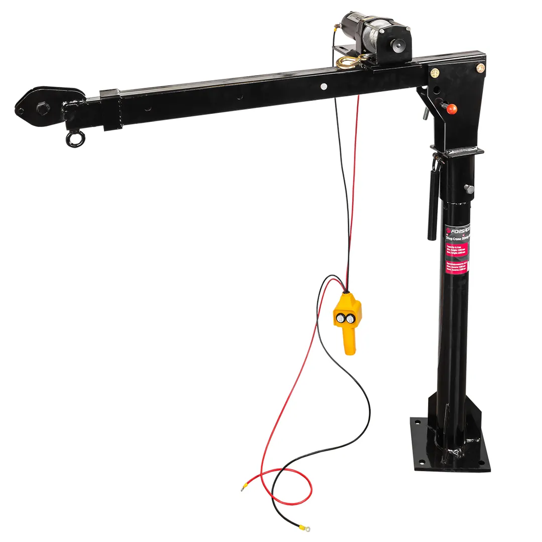 Кран электрический представляет собой стационарное устройство, предназначенное для подъема грузов. Применяется главным образом на станциях технического обслуживания для монтажа-демонтажа автомобильных агрегатов. Кран установлен на поворотной опоре и обладает регулируемой длиной стрелы, что увеличивает его маневренность и удобство при работе. Устройство оснащено автомобильной лебедкой на 12В, что обеспечивает высокую мощность и производительность крана. Эта модель также рассчитана на установку в кузов транспортного средства (пикап, эвакуатор и т.п.).