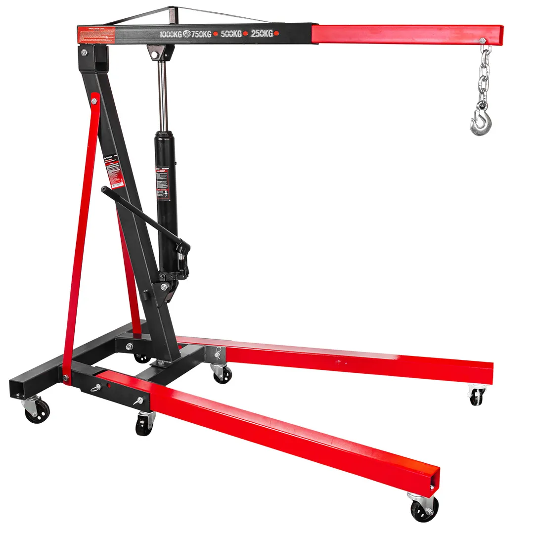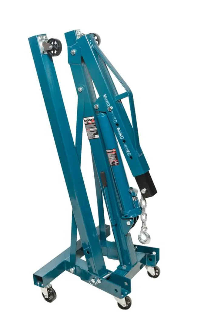 Складной гидравлический кран успешно справляется с подъемом и перемещением грузов массой до 1 тонны. Модель используется в автосервисах, а также на производстве. Установка имеет складную конструкцию и 6 поворотных колёс, благодаря чему ее легко хранить и транспортировать. Устройство не требует сложного технического обслуживания и не доставляет сложностей в эксплуатации.
