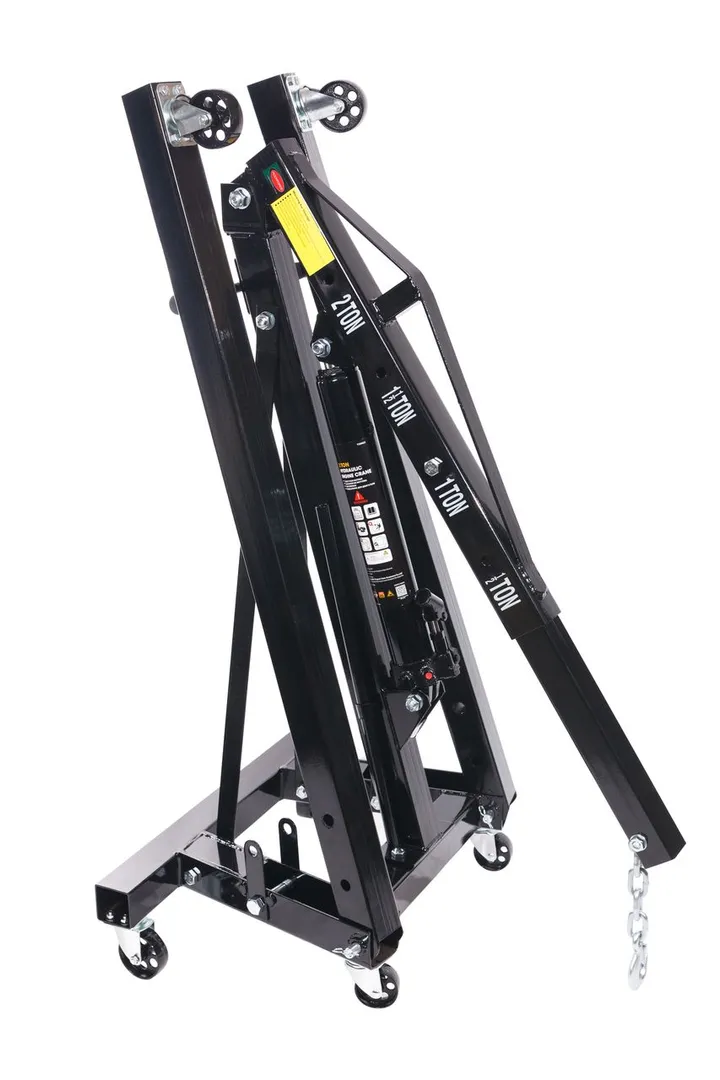 Складной гидравлический кран успешно справляется с подъемом и перемещением грузов массой до 2 тонн. Модель используется в автосервисах, а также на производстве. Установка имеет складную конструкцию и 6 поворотных колёс, благодаря чему ее легко хранить и транспортировать. Устройство не требует сложного технического обслуживания и не доставляет сложностей в эксплуатации.