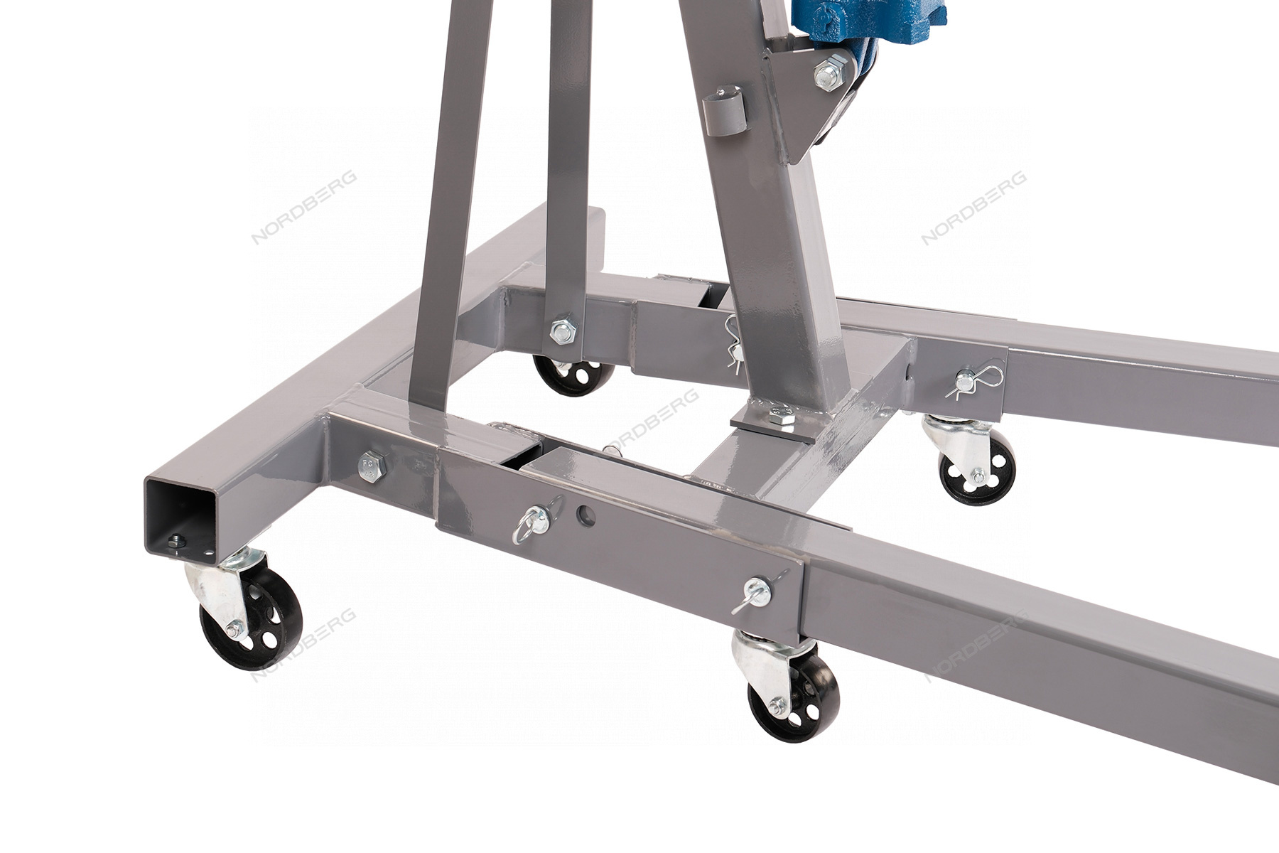- Высота нижних опор на поворотных колесах 17 см позволяет легко позиционировать кран под автомобилем, а достаточное расстояние между опорами, обеспечивает уверенную устойчивость крана во время рабочих операций.