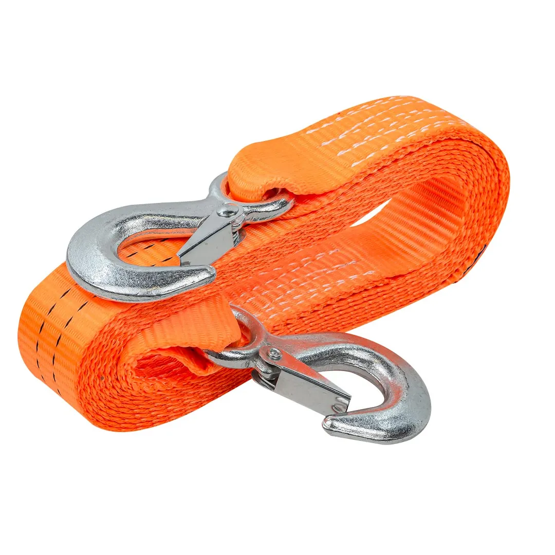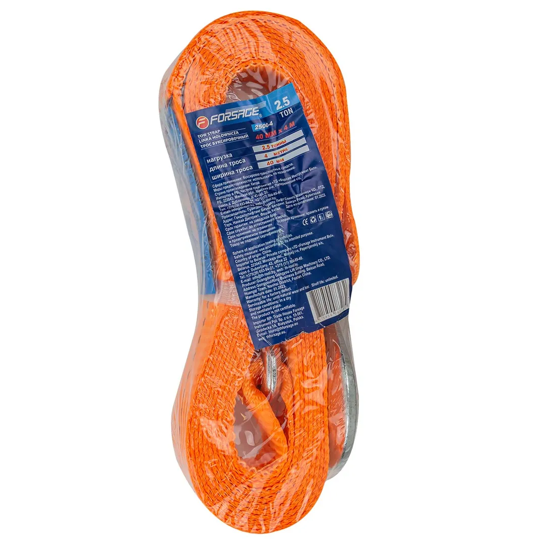 Буксировочный трос является специальным инструментом, который используется для буксировки автомобилей или других транспортных средств. Он изготавливается из прочного материала как полиэстер и имеет крюки карабины повышенной прочности на концах для крепления к автомобилю. Лента для авто длинной 4 метра и шириной 40 мм. Максимальная нагрузка 2,5 тонны. Ремень автомобильный (стропа) позволяет безопасно и эффективно буксировать грузовой или легковой автомобиль в случае поломки или аварии. При эксплуатации необходимо избегать провисания троса и рывков, а также попадания ленты под колеса. Рекомендуется использовать трос с разрывной нагрузкой, превышающей массу буксируемого автомобиля. Для этого нужно снаряженную массу автомобиля умножать на 3, затем подбираем трос с равной или большей нагрузкой. Этот аксессуар является важной частью аварийного набора каждого автовладельца и могут понадобиться в различных ситуациях на дороге.