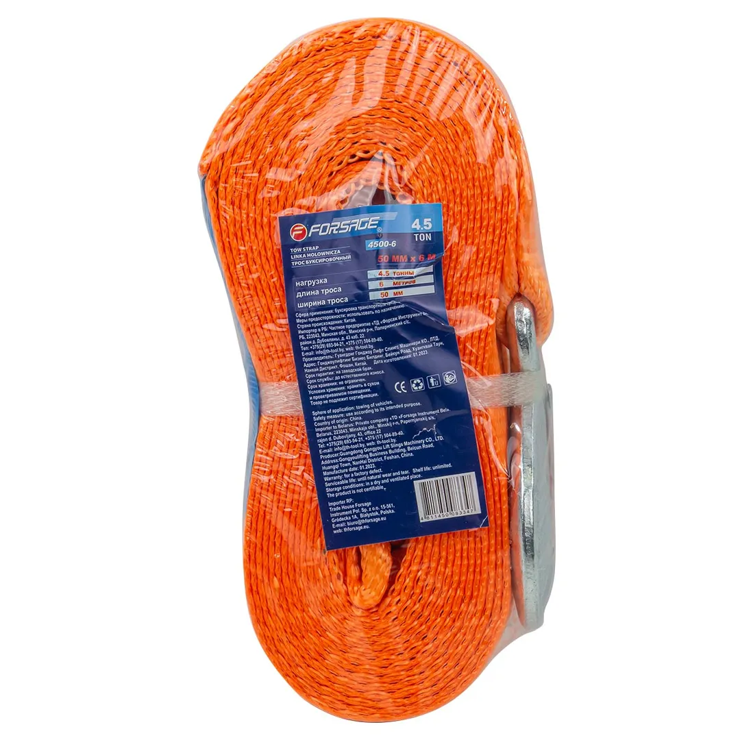 Буксировочный трос является специальным инструментом, который используется для буксировки автомобилей или других транспортных средств. Он изготавливается из прочного материала как полиэстер и имеет крюки карабины повышенной прочности на концах для крепления к автомобилю. Лента для авто длинной 6 метров и шириной 50 мм. Максимальная нагрузка 4,5 тонны. Ремень автомобильный (стропа) позволяет безопасно и эффективно буксировать грузовой или легковой автомобиль в случае поломки или аварии. При эксплуатации необходимо избегать провисания троса и рывков, а также попадания ленты под колеса. Рекомендуется использовать трос с разрывной нагрузкой, превышающей массу буксируемого автомобиля. Для этого нужно снаряженную массу автомобиля умножать на 3, затем подбираем трос с равной или большей нагрузкой. Этот аксессуар является важной частью аварийного набора каждого автовладельца и могут понадобиться в различных ситуациях на дороге.