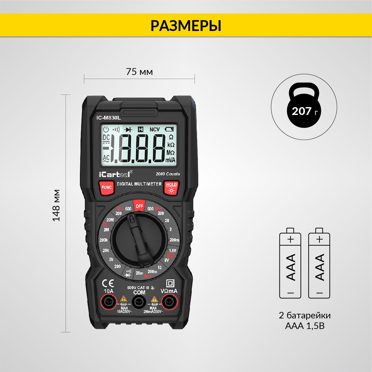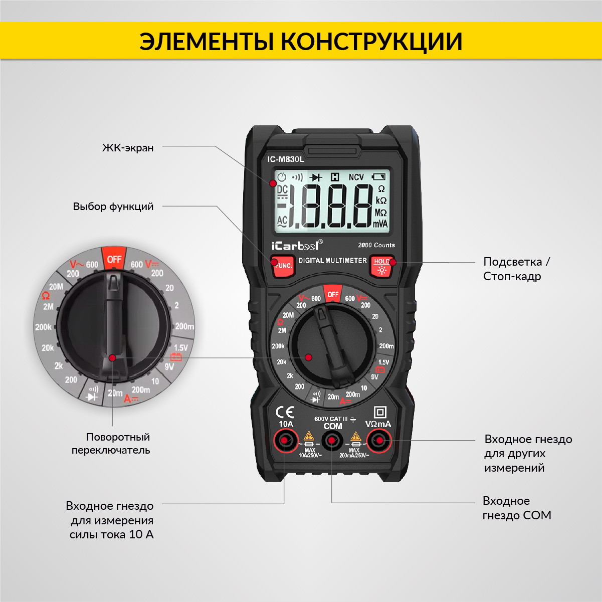 IC-M830L — многофункциональный мультиметр с классическим набором функций. Станет незаменимым помощником на производстве или дома. С помощью тестера вы сможете измерить напряжение постоянного или переменного тока, провести тест диодов, замерить сопротивление и выполнить "прозвонку" цепи.